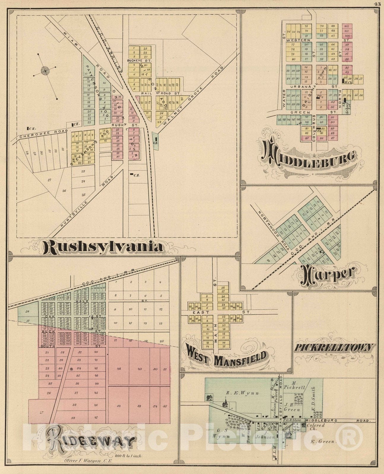 Historic Map : 1875 Rushsylvania, Ridgeway, Middleburg, Harper, West Mansfield, and Pickelltown, Logan County, Ohio. - Vintage Wall Art