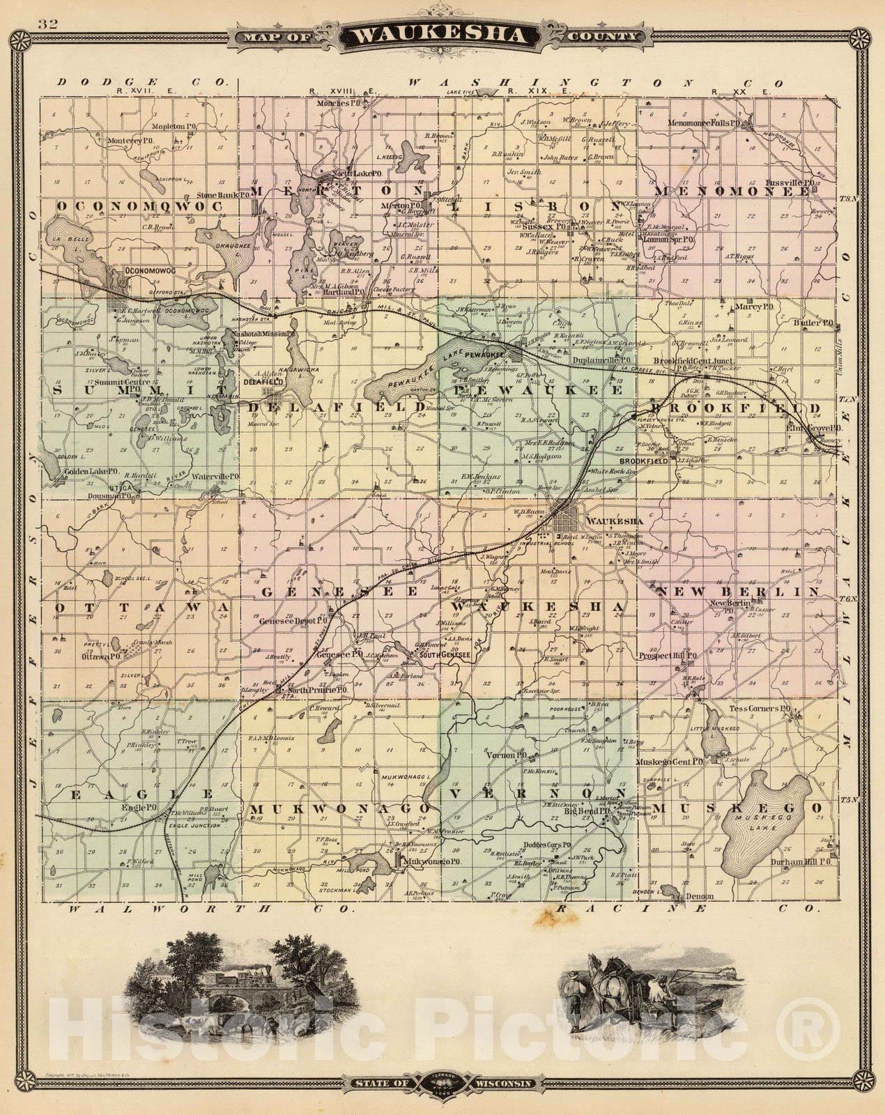Historic Map : 1878 Map of Waukesha County, State of Wisconsin. - Vintage Wall Art