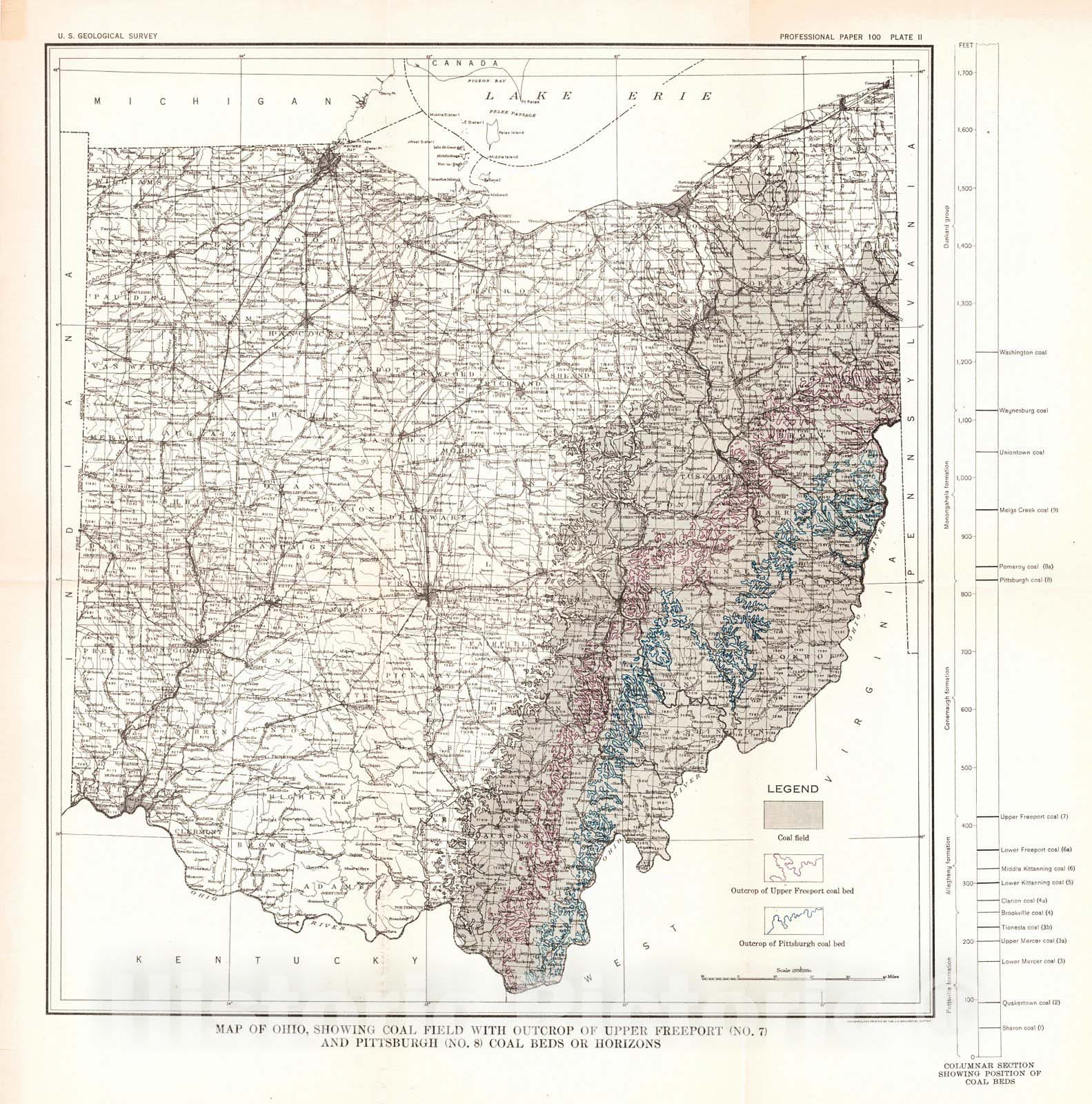 Historic Map : 1929 Map of Ohio, showing coal field with outcrop of Upper Freeport and Pittsburgh coal beds on horizon : Vintage Wall Art