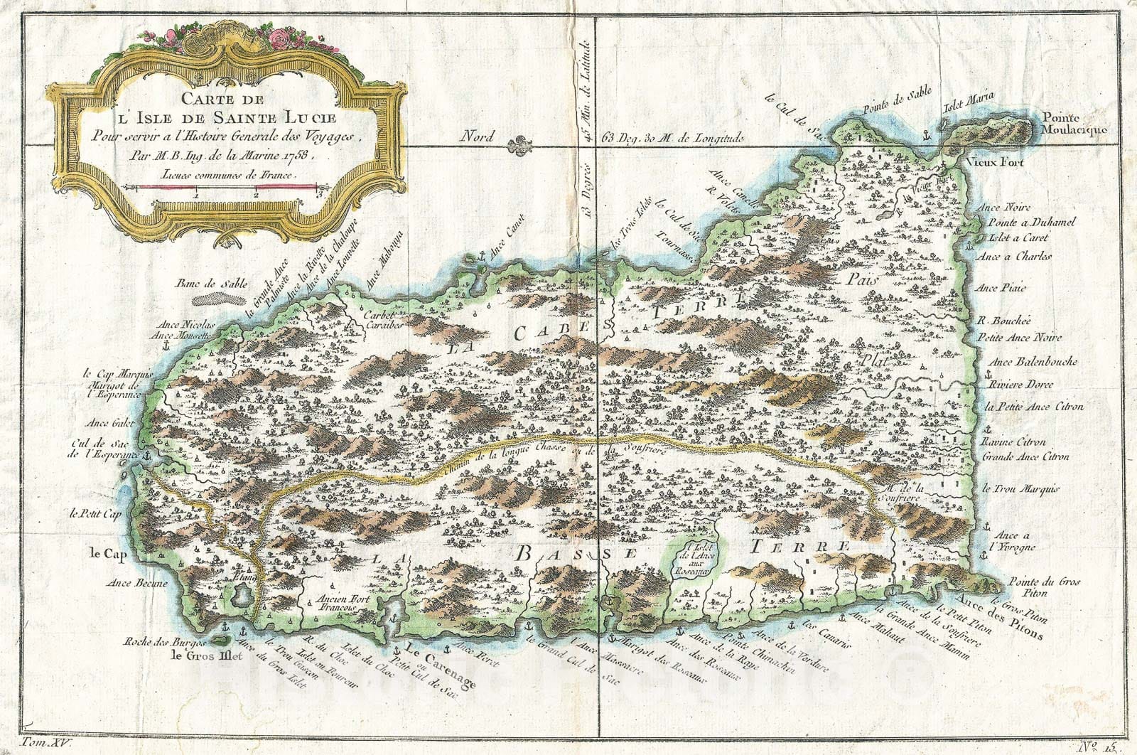 Historic Map : Bellin Map of St. Lucia (St. Lucie), in The West Indies, 1758, Vintage Wall Art