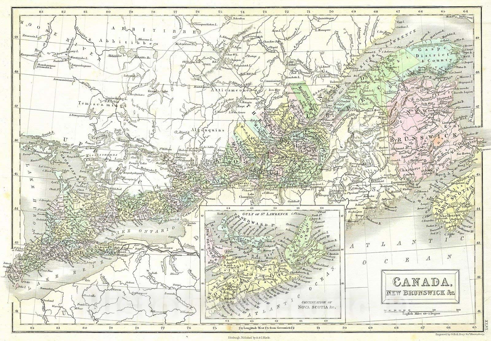 Historic Map : Black Map of Eastern Canada (Ontario, New Brunswick), 1851, Vintage Wall Art