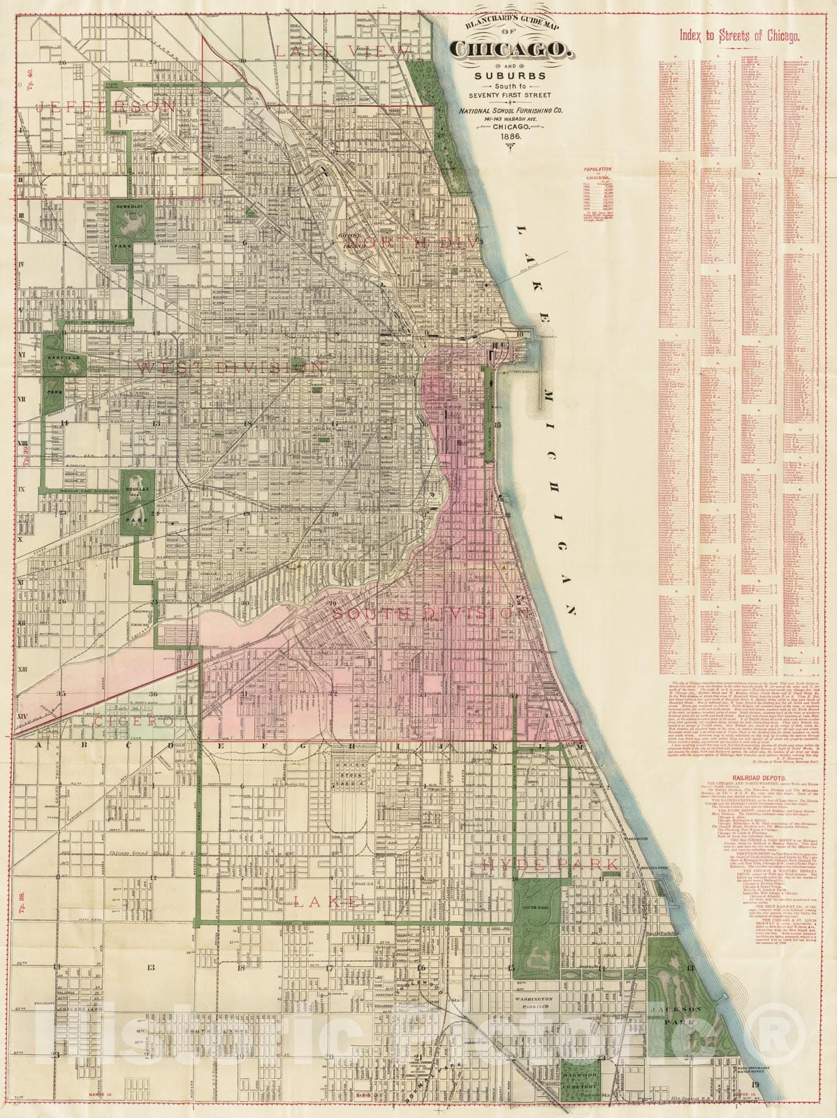 Blanchard's Map of Chicago, Illinois (IL), 1886 - Historic Wall Art