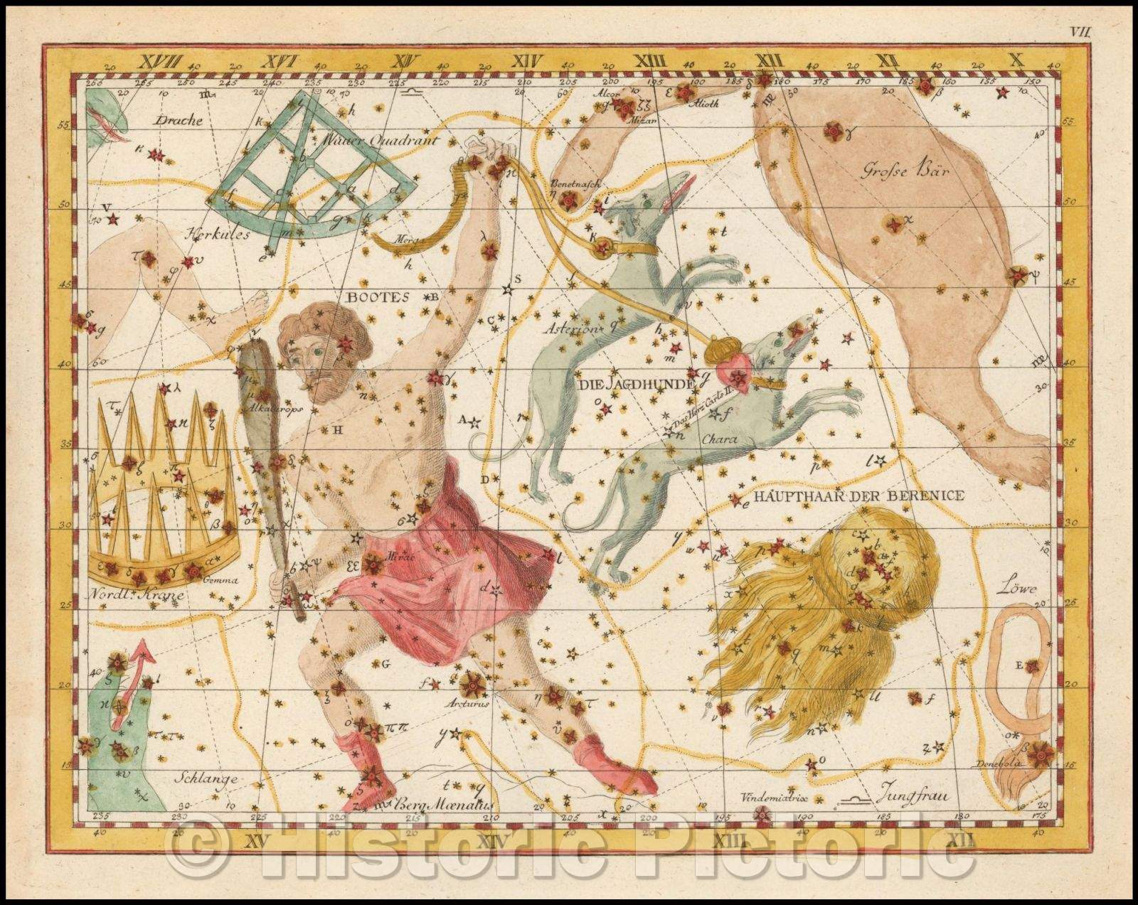 Historic Map - Bootes, Die Jagdhunde, Haupthaaer, Der Berenice/Star Chart centered the constellations Bootes and Mons Moenalus Asterion, 1805 - Vintage Wall Art