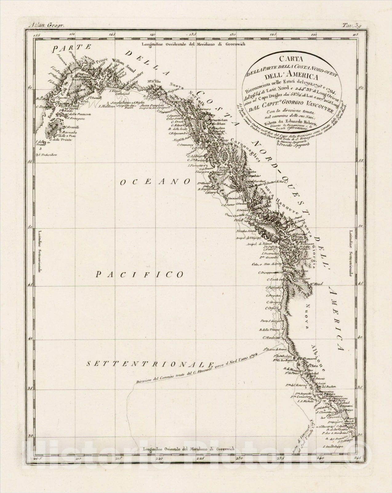 Historic Map : Carta della Parte della Costa Nord-Ouest Dell'America Rcionosciuta nelle Estati del 1792, 1793, e 1794, . dal Capito Giorgio Vancouver, c1820, Vintage Wall Art