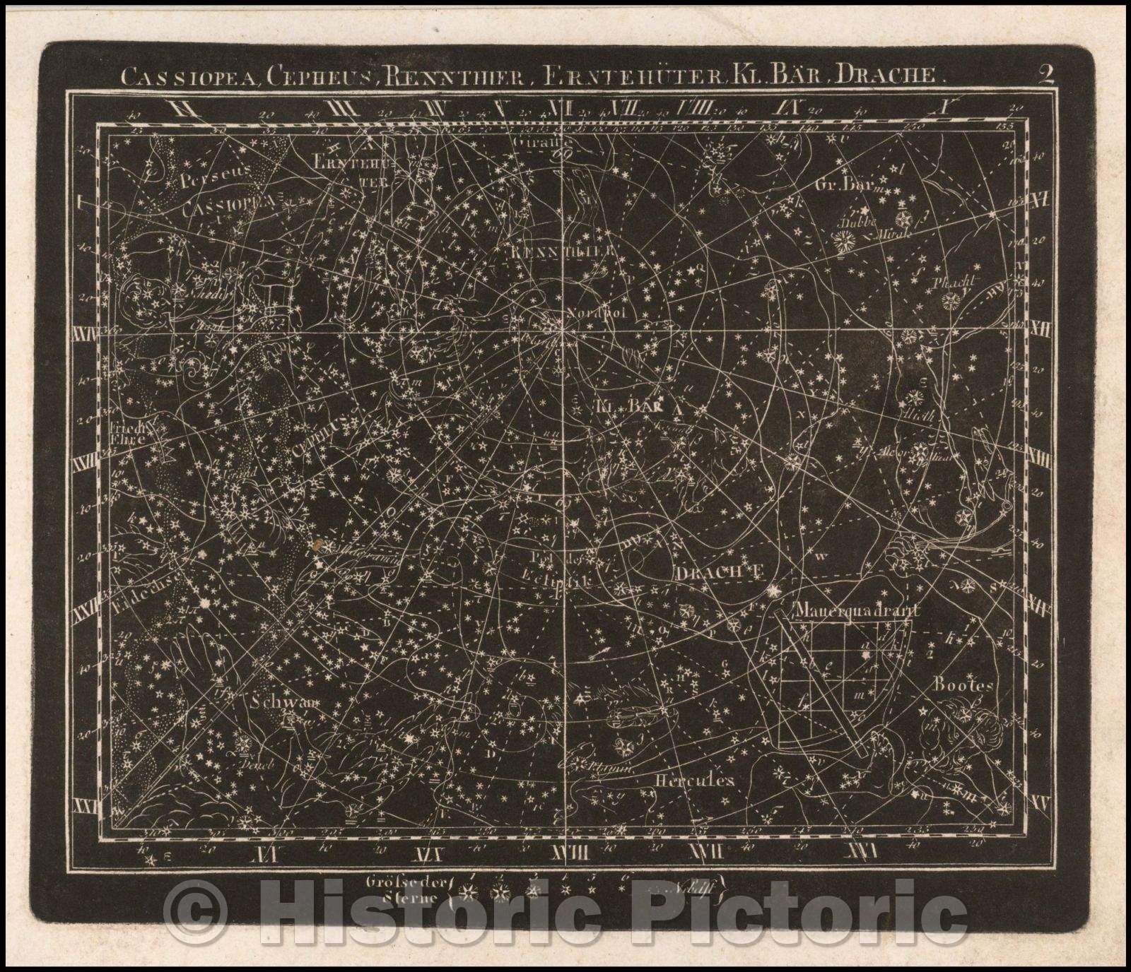 Historic Map - Cassiopea, Cepheus, Rennthier, Erntehuter, Kl. Bar. :: Celestial Map, constellations on a night sky, published by Christian Friedrich Goldbach, 1799 - Vintage Wall Art