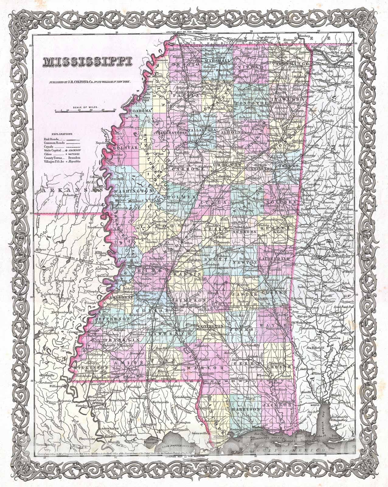 Historic Map : Colton Map of Mississippi, 1855, Vintage Wall Art