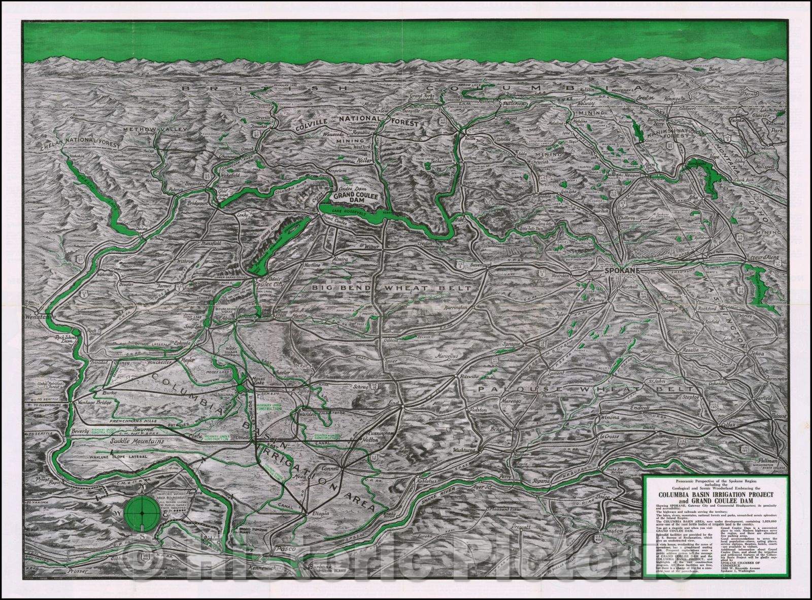 Historic Map - Columbia Basin Irrigation Project Grand Coulee Dam :: Panoramic Perspective of the Spokane Region, 1948 - Vintage Wall Art