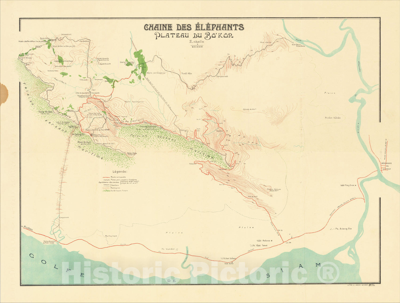 Historic Map : [Elephants and Tourism] Chaine Des Elephants Plateau Du Bo'kor [Southeastern Cambodia], 1925, A. Ardin, Vintage Wall Art