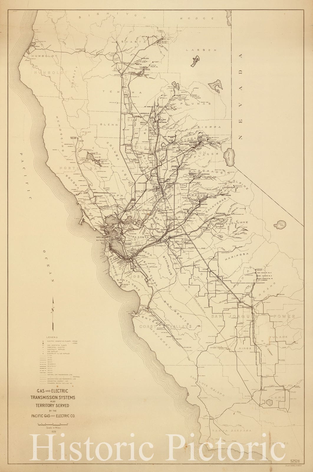 Historic Map : Gas and electric transmission system and territory served by Pacific Gas and Electric Co. 1939 - Vintage Wall Art