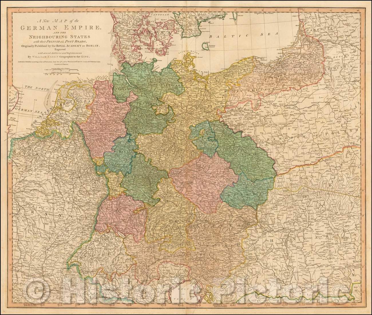 Historic Map - The German Empire, and the Neighbouring States with the Principal Post Roads, Originally, 1788, William Faden v1
