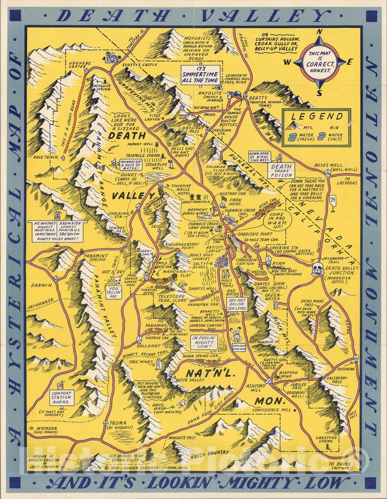 A Hysterical Map of Death Valley National Monument and It's Lookin' Mighty Low. | A Hysterical Map of Death Valley National Monument and It's Lookin' Mighty Low. | In 1932 the Lindgren Brothers of Spokane, Washington began manufacturing colorful silk-screened maps depicting iconic national parks and other scenic areas. With emphasis on both verbal and visual humor, they titled these inexpensive tourist souvenirs "Hysterical Maps," seeking to distinguish them from "historical" pictorial maps, a genre then in vogue. Aimed at the middle-class American tourist, they were available for purchase at gas stations and other stops along the vacation route, with the mailing envelope allowing them to be easily sent to friends or relatives as souvenirs.