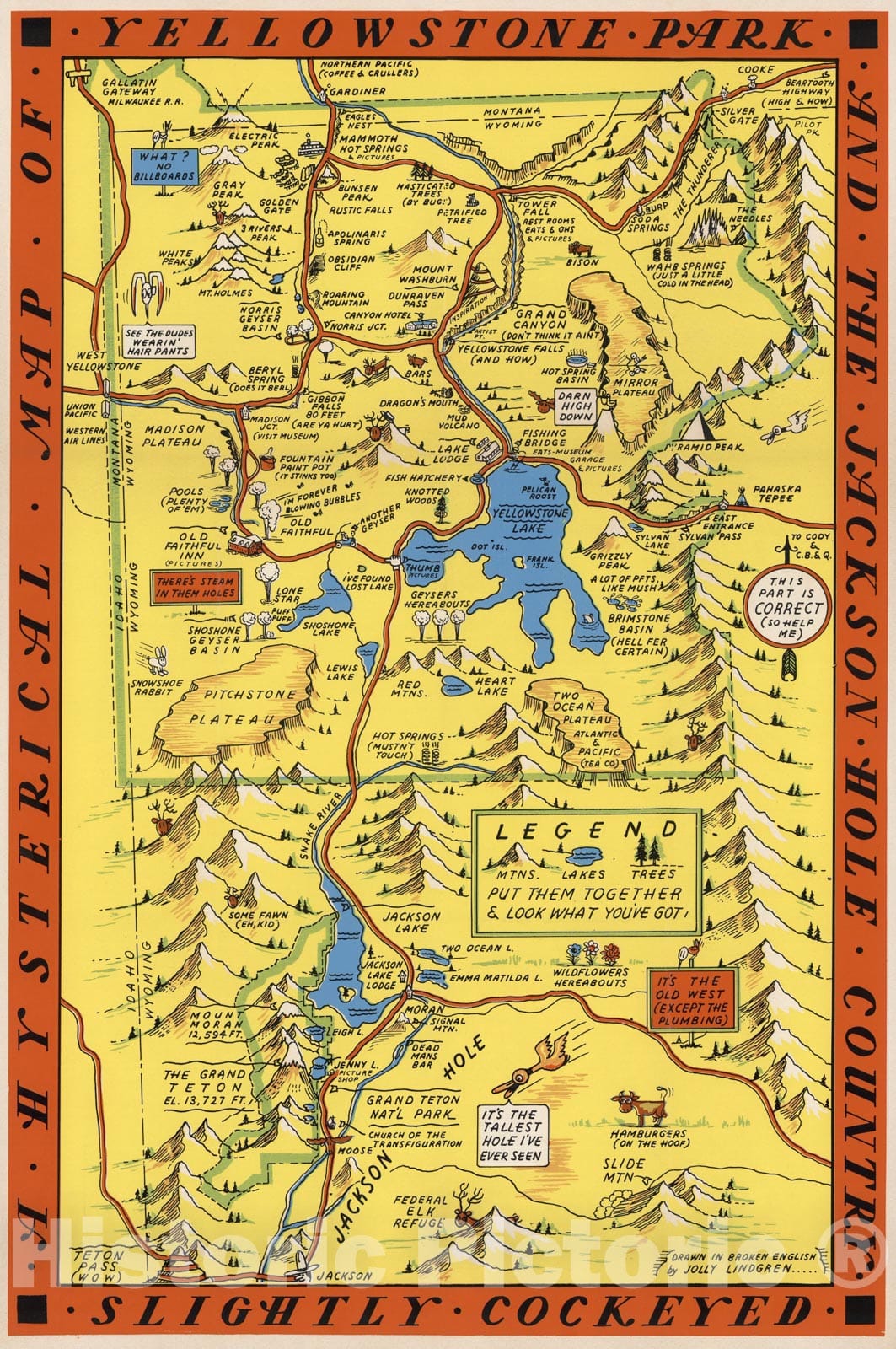 A Hysterical Map Of The Yellowstone Park And The Jackson Hole Country. Slightly Cockeyed. Drawn in Broken English by Jolly Lindgren. | A Hysterical Map Of The Yellowstone Park And The Jackson Hole Country. Slightly Cockeyed. Drawn in Broken English by Jolly Lindgren. | See note map above.