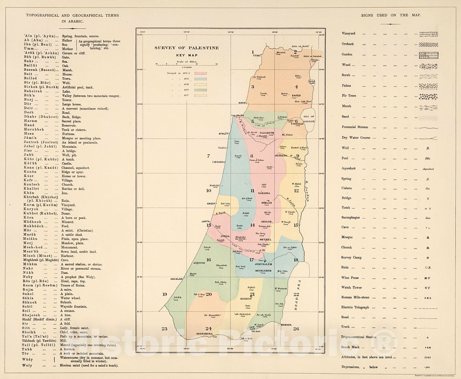 Historic Map : Index Map: Topographical and Geographical Terms in Arabic (and English). Key Map; Signs Used on the Map., 1882, Vintage Wall Decor