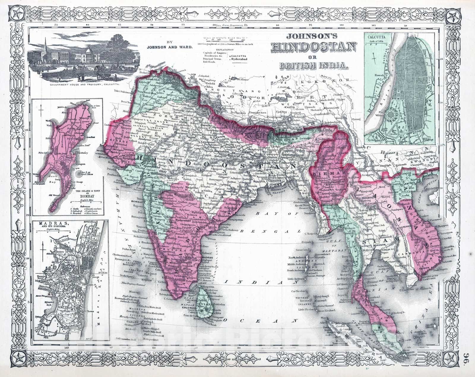 • .Historic Map : India; Thailand; Vietnam; Myanmar, 1865 Hindostan Or British India. , Vintage Wall Art