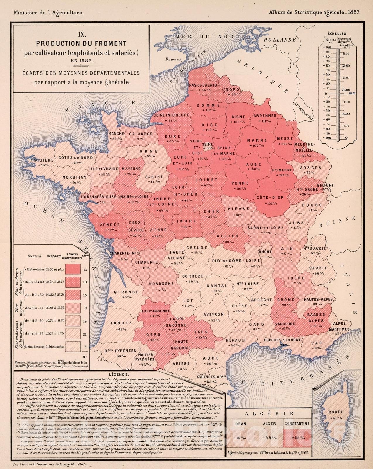 Historic Map : IX. Production du froment par cultivateur (exploitant et salaries), En 1882, 1887, Vintage Wall Decor