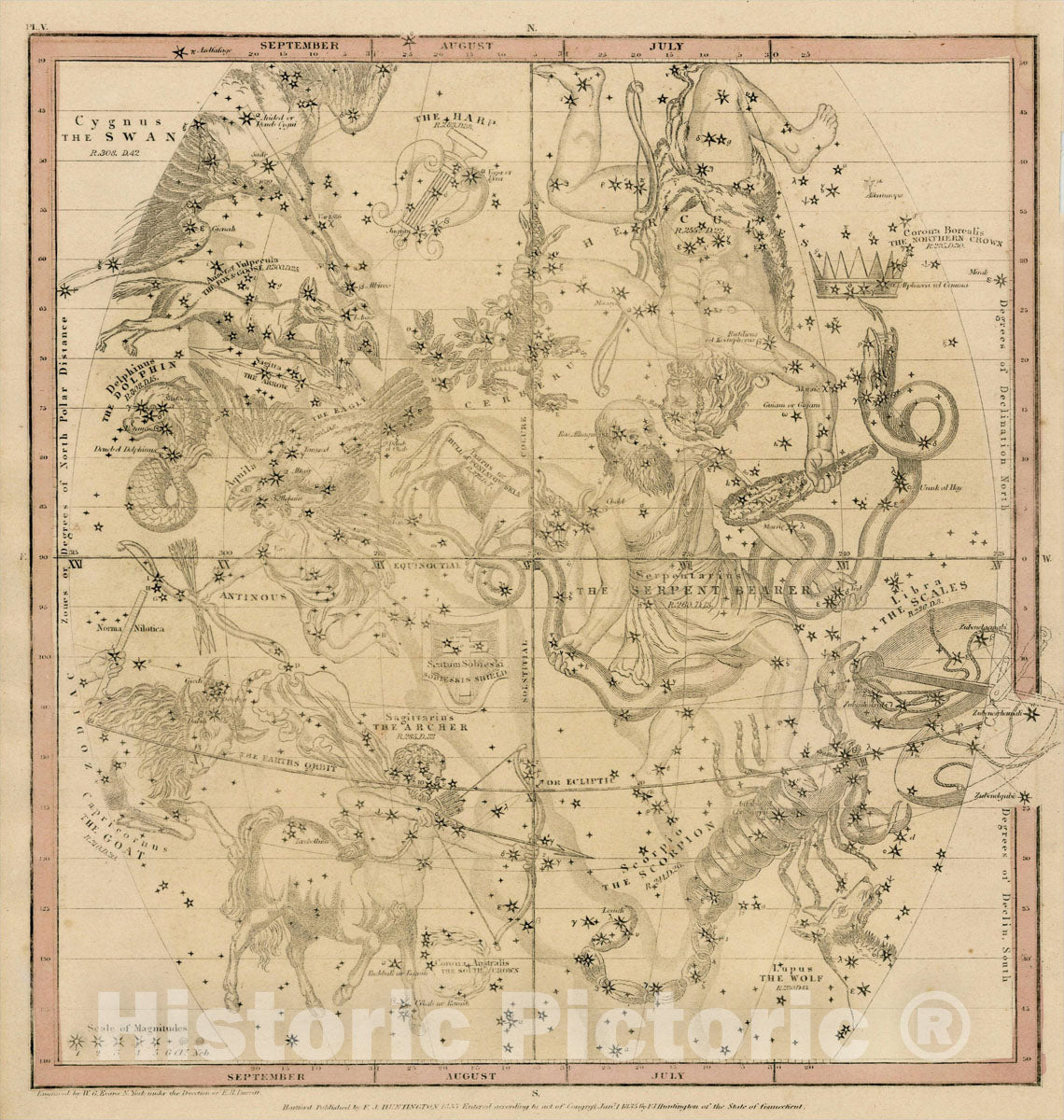 Historic Map : The July, August & September Sky -- Sagittarius, Scorpio, Libra, Capricorn, Hercules, Corona Boralis, Serpentrarius, 1835, Elijah J. Burritt, Vintage Wall Art
