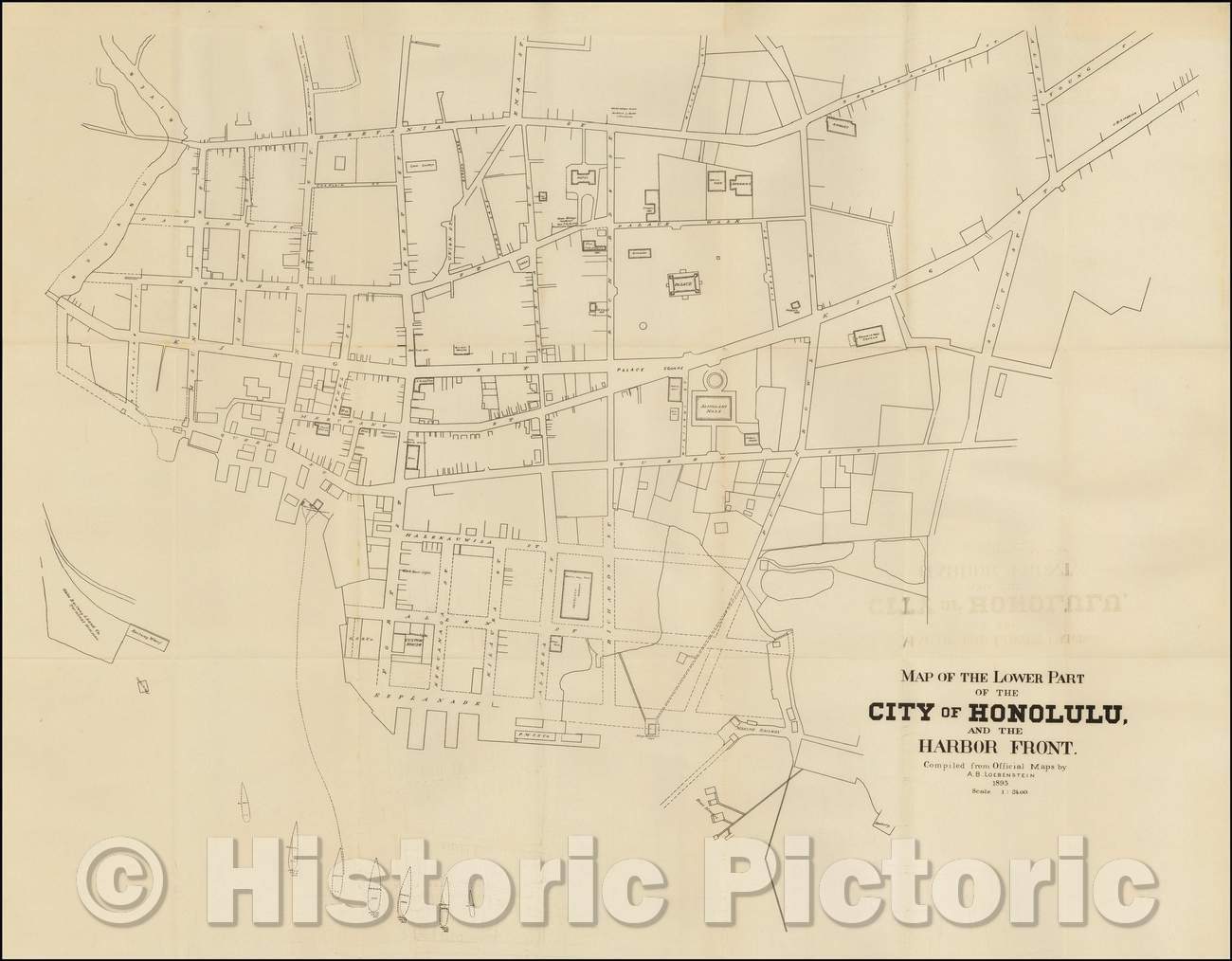 Historic Map - Map of the Lower Part of The City of Honolulu and the Harbor Front, 1893, A. B. Loebenstein - Vintage Wall Art