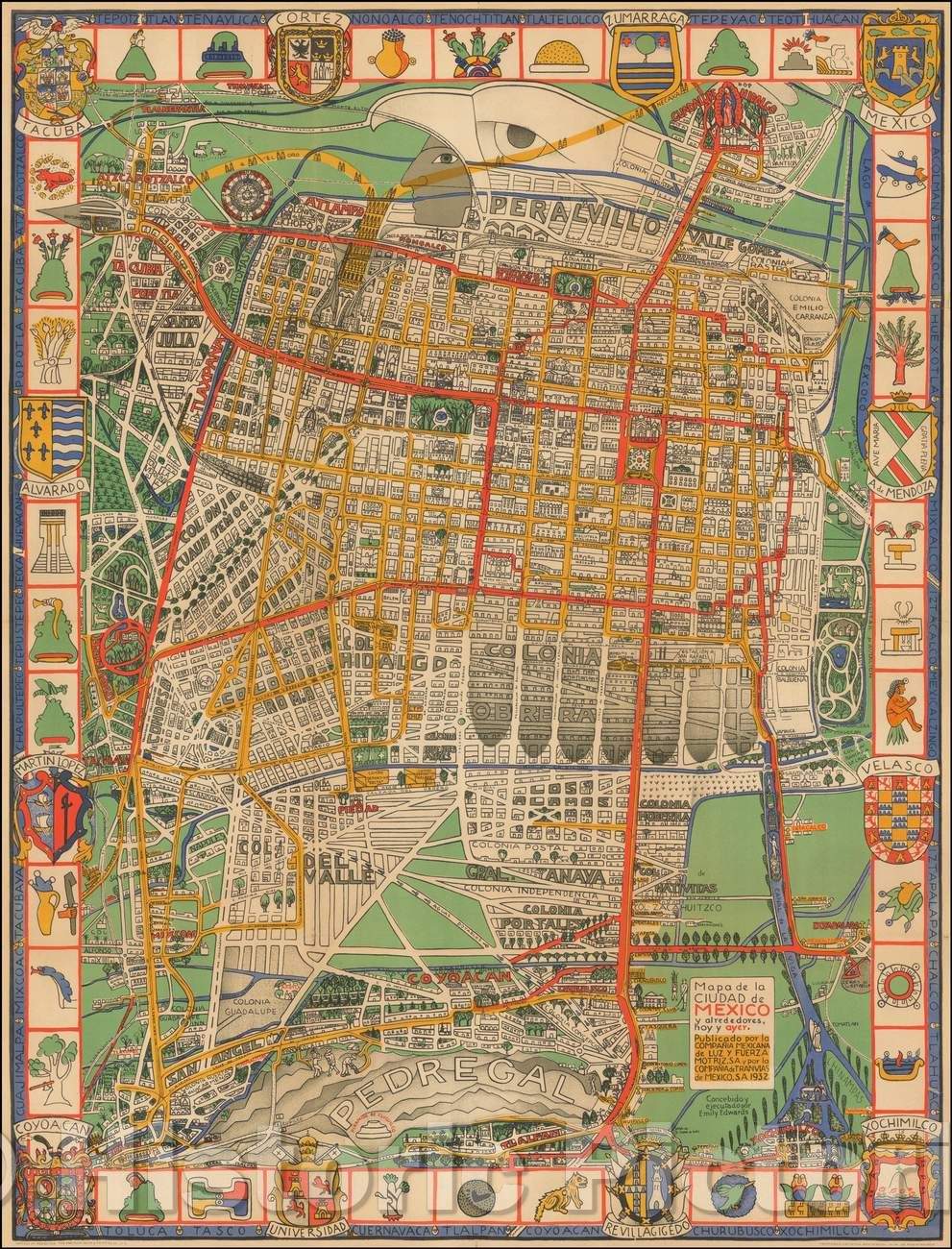 • .Historic Map - Mapa de la Ciudad de Mexico y alrededores, hoy y ayer/Map Mexico City Area today and yesterday. 1932, 1932, Emily Edwards - Vintage Wall Art