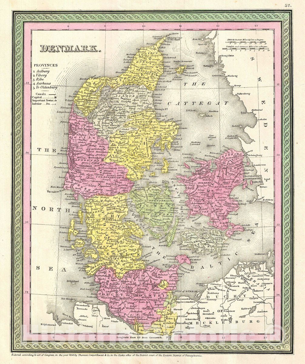 Thomas Cowperthwait and S. A. Mitchell's 1854 map of Denmark. The whole is engraved in Mitchell's distinctive style with green border work and vivid pastels. Political and topographical features are noted and color coded with elevation rendered by hachure. Covers all of Denmark inclusive of the Duchy of Holstein. A list along the upper left border notes Denmark's five Provinces: Aalborg, Viborg, Ribe, Aarhuus, and To Oldenburg.