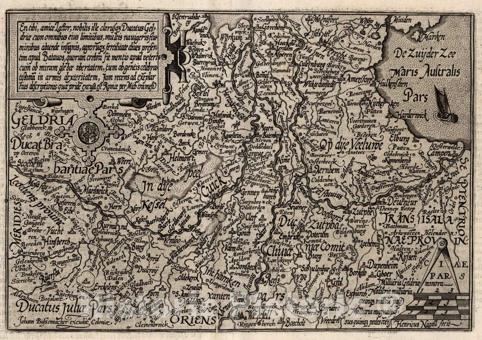 41. (Gelderlandt). | Geographisch Handtbuch ... Matthis Quaden ... Coln am Rein (Cologne). MDC (1600). | Matthias Quad was a map publisher based in Cologne, Germany. but had lived and was trained in the Netherlands. His first atlas was Europae...Descriptio of 1592 with 38 maps, expanded to 50 maps in 1594. This was expanded again in 1600 to this Geographisch Handtbuch with 82 maps. These books were both smaller pocket atlases intended to be less expensive alternatives to the larger folio atlases of Ortelius, Mercator, and De Jode, which also provided the source maps for Quad's atlas maps. Quad embellished his maps with scenes, portraits and other illustrations that make them rather unique. The Geographisch Handtbuch was the first atlas originally written with German text. Quad also produced larger single sheet maps, including a map of Europe in the form of a Queen (1587) and city plans for the Braun and Hogenberg Civitates Orbis Terrarum. In 1608 Quad published a third atlas with 86 maps, Fasciculus Geographicus.