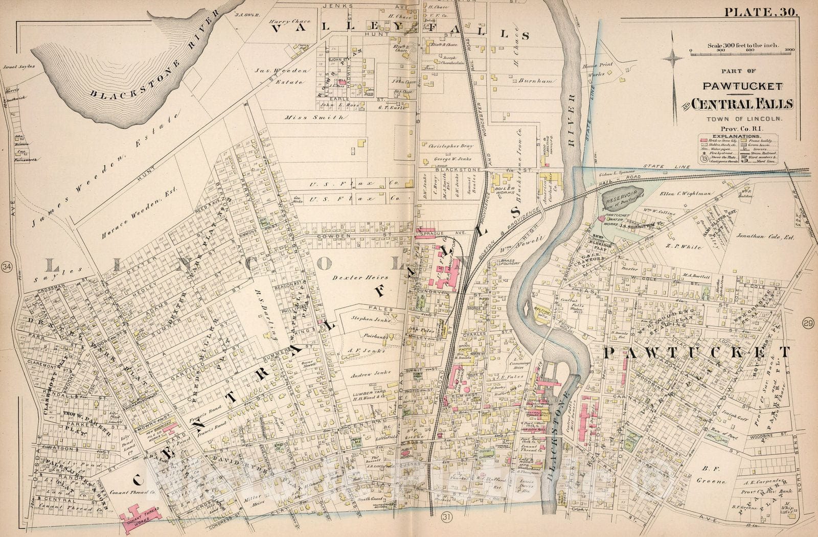 Historic Map : Pawtucket (R.I.), City Atlas Map, Plate 30. Part of Pawtucket and Central Falls, Town of Lincoln, Prov. Co, R.I. 1882 - Vintage Wall Art