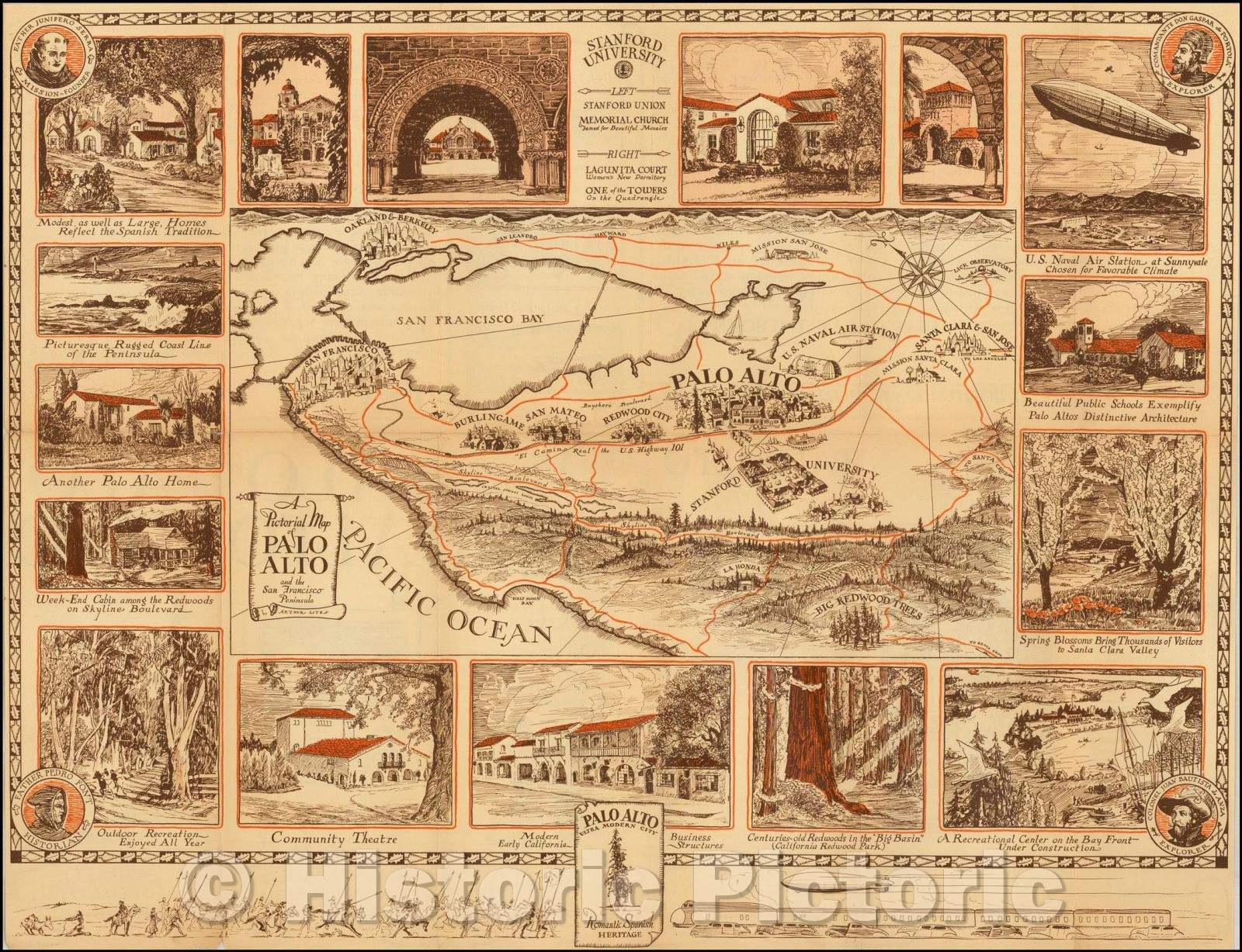 Historic Map - A Pictorial Map of Palo Alto and the San Francisco Peninsula, 1940, Arthur Lites - Vintage Wall Art