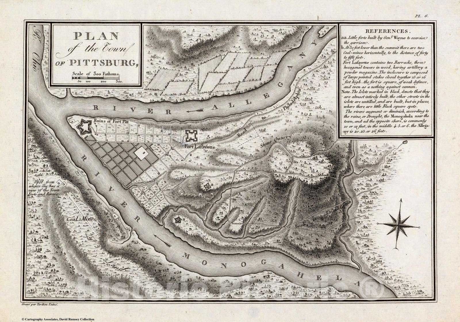 Plan of the Town of Pittsburg. Grave par Tardieu l'aine. PL. 6. | A Journey in North America, containing a Survey of the Countries watered by the Mississippi, Ohio, Missouri, and other Affluing Rivers; with Exact Observations on the Course and Soundings of these Rivers; and on the Towns, Villages, Hamlets, and Farms of that Part of the New World; followed by Philosophical, Political, Military and Commercial Remarks, and by a Projected Line of Frontiers and General Limits. Illustrated by an Atlas of 36 Maps, etc. By Gen. V. Callot, late in the French Service, and Governor of Guadeloupe. |