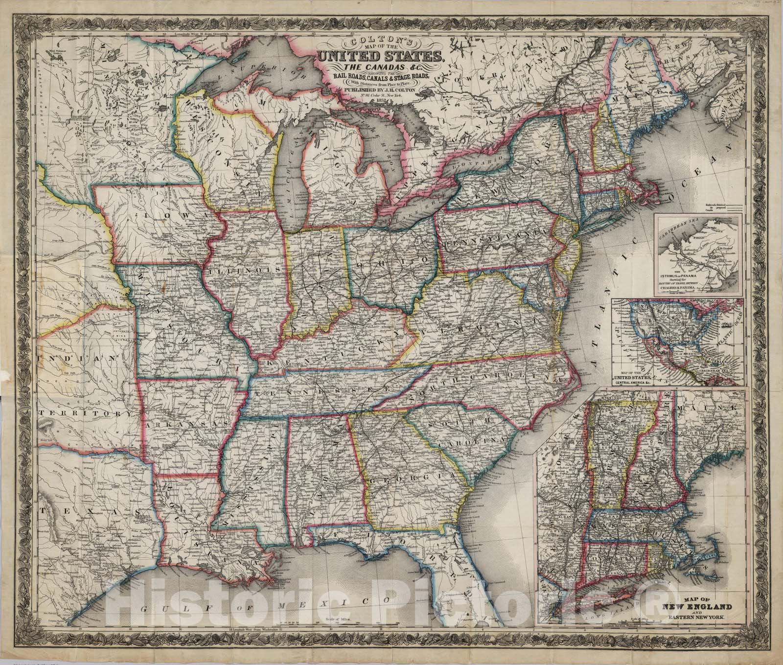 Colton's Map Of The United States, The Canadas &c. Showing The Rail Roads, Canals & Stage Roads: With Distances from Place to Place. Published by J.H. Colton No. 86 Cedar St., New York, 1852. (inset) Map Of New England And Eastern New York. (inset) Map Of The United States, Central America &c. (inset) The Isthmus Of Panama Showing the Routes Of Travel Between Chagres & Panama. | Colton's Map Of The United States, The Canadas &c. Showing The Rail Roads, Canals & Stage Roads: With Distances from Place to Place. Published by J.H. Colton No. 86 Cedar St., New York, 1852. (inset) Map Of New England And Eastern New York. (inset) Map Of The United States, Central America &c. (inset) The Isthmus Of Panama Showing the Routes Of Travel Between Chagres & Panama. | See note field above.