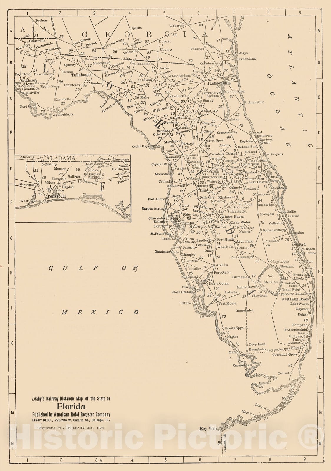 Leahy's Hotel Guide and Railway Distance Map of the State of Florida. Published by American Hotel Register Company. Leahy Build., 228-234 W. Ontario St., Chicago, Ill. Copyrighted by J.F. Leahy, Jan., 1934. (inset) Continuation of the map. | Leahy's Hotel Guide and Railway Distance Maps of America. The Green book, It Shows the Way. Published by American Hotel Register Company. Leahy Building 228-234 W. Ontario street, Chicago, Ill. Established Nearly Half Century. Revised Edition No. 59, Copyrighted Jan. 1934. Price of this book, complete $5.00. Subscription, Five Years .... $20.00, Combined Guide and Map of any Individual State 25 cents. | A guide to accompany the revised edition No. 59 of Leahy's Hotel Guide and Railway Distance Maps of America. It lists the Hotels of the town with the number of rooms of each, their rates per day and the population of the town. It includes the name of the railroads entering the town and where the town can be found on the map. Maps of each state are opposite the State lists of towns and hotels making it easy and convenient to refer from the one to the other. The maps give the railroad distance between towns. The Guide includes the Provinces of Canada, as well as the United States. The railroad distance maps of Europe, Mexico, South and Central America ... Maps printed without color, Railroad lines shown in red on some maps. The Guidebook is bound in Green paper covers with title in gold: Leahy's Hotel Guide and R.R. Distance Maps. Southern Pacific Lines.