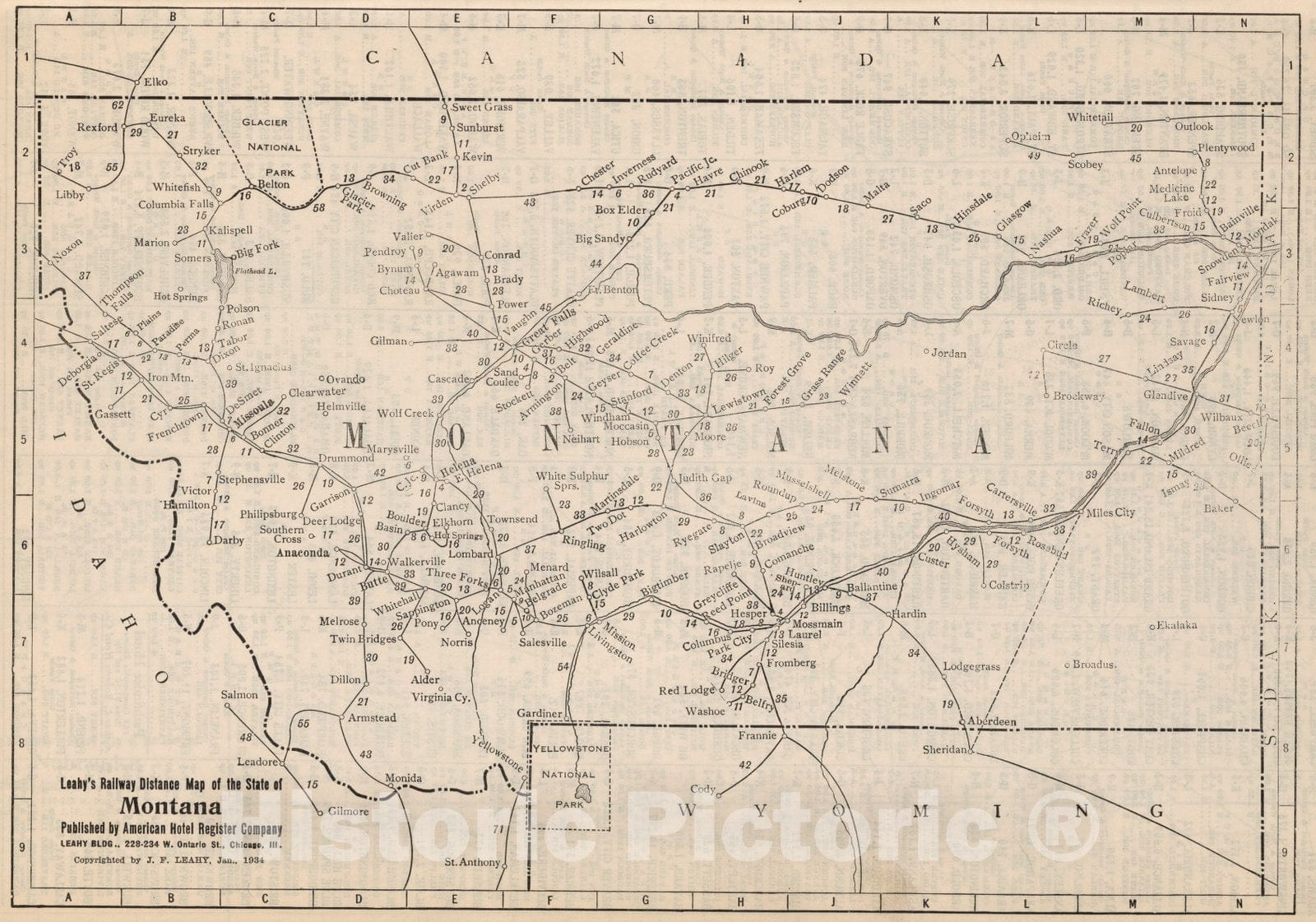 Leahy's Hotel Guide and Railway Distance Map of the State of Montana. Published by American Hotel Register Company. Leahy Build., 228-234 W. Ontario St., Chicago, Ill. Copyrighted by J.F. Leahy, Jan., 1934. | Leahy's Hotel Guide and Railway Distance Maps of America. The Green book, It Shows the Way. Published by American Hotel Register Company. Leahy Building 228-234 W. Ontario street, Chicago, Ill. Established Nearly Half Century. Revised Edition No. 59, Copyrighted Jan. 1934. Price of this book, complete $5.00. Subscription, Five Years .... $20.00, Combined Guide and Map of any Individual State 25 cents. | A guide to accompany the revised edition No. 59 of Leahy's Hotel Guide and Railway Distance Maps of America. It lists the Hotels of the town with the number of rooms of each, their rates per day and the population of the town. It includes the name of the railroads entering the town and where the town can be found on the map. Maps of each state are opposite the State lists of towns and hotels making it easy and convenient to refer from the one to the other. The maps give the railroad distance between towns. The Guide includes the Provinces of Canada, as well as the United States. The railroad distance maps of Europe, Mexico, South and Central America ... Maps printed without color, Railroad lines shown in red on some maps. The Guidebook is bound in Green paper covers with title in gold: Leahy's Hotel Guide and R.R. Distance Maps. Southern Pacific Lines.