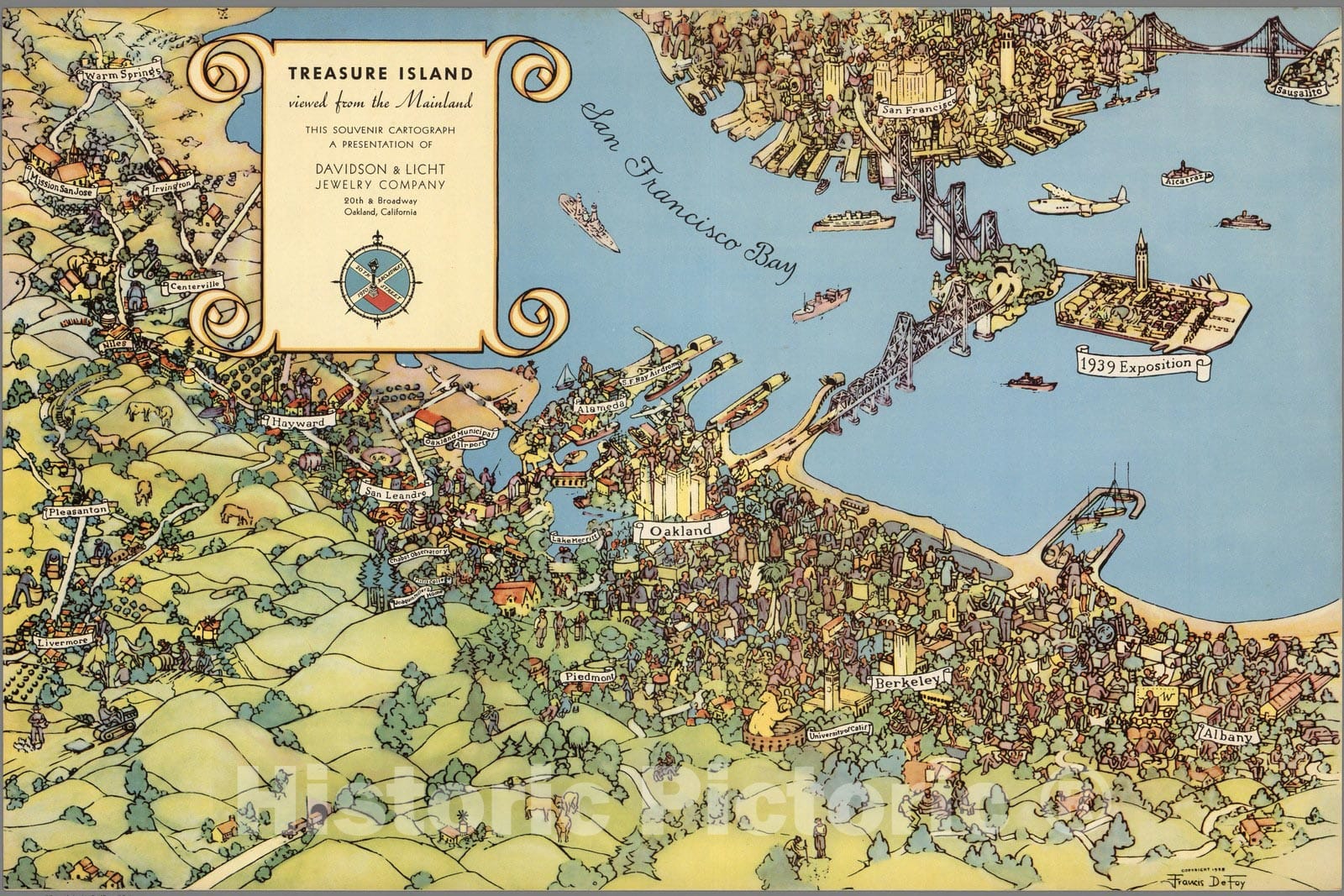 Treasure Island viewed from the Mainland. This Souvenir Cartograph a Presentation of Davidson & Licht Jewelry Company. | Treasure Island viewed from the Mainland. This Souvenir Cartograph a Presentation of Davidson & Licht Jewelry Company. |