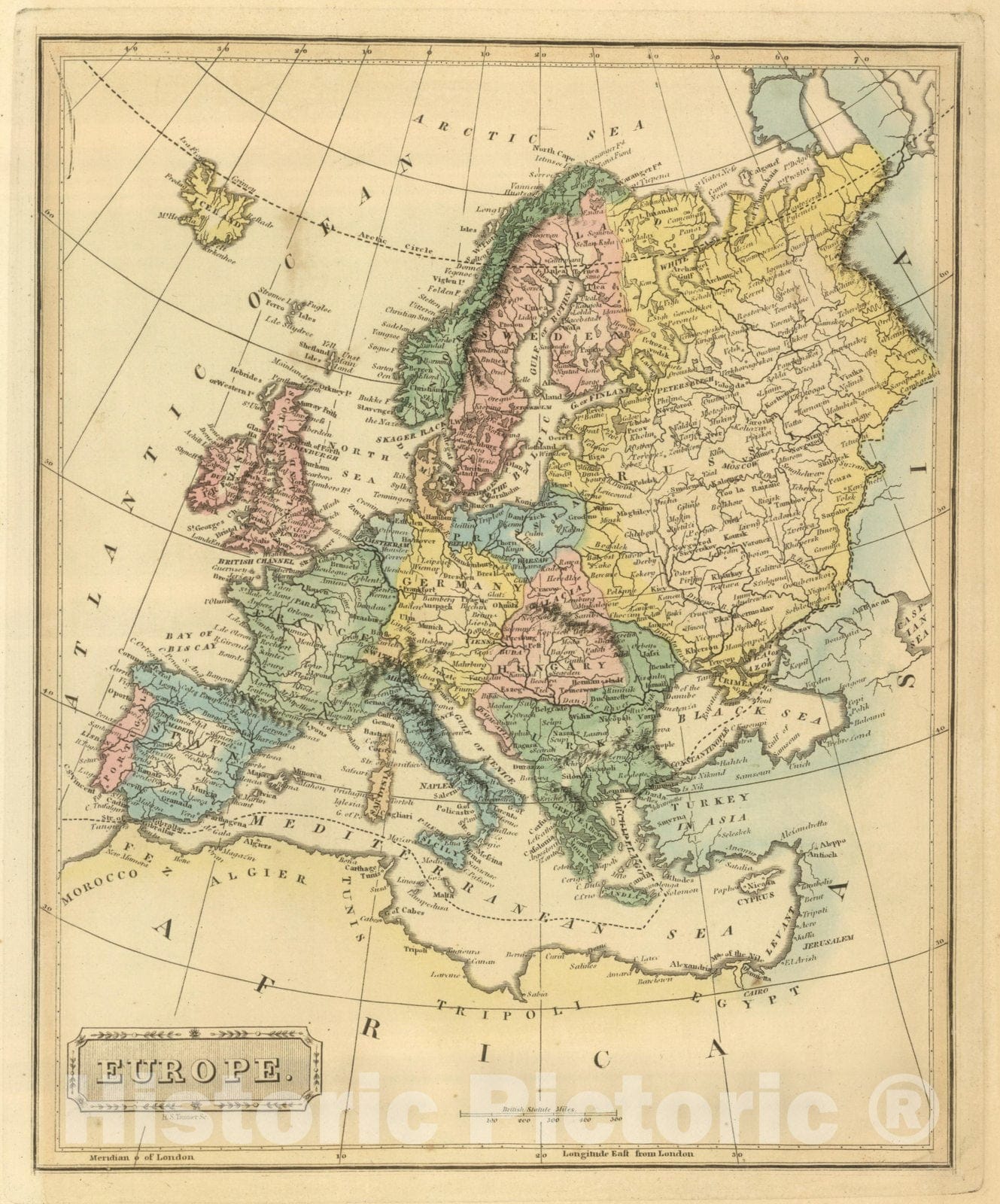Europe. H.S. Tanner, Sc. (1822) | A General Atlas, Of All The Known Countries In The World. Baltimore: Published by Fielding Lucas, Junr. No. 138, Market Street ... | This is a very unusual Lucas atlas - according to Foster, only two copies are known. The engraved title page shows a globe and books on a table, with pages open listing Lucas' products: "Drawing Materials of every kind, Paper of all sizes, Mathematical Instruments, Globes, Maps, and Atlases of every description suitable for Colleges and Schools constantly for sale by the Publisher." It has 31 of the Tanner and Harrison engraved maps of the continents and foreign countries that appeared in the (1815) and (1816) "New And Elegant General Atlas" (only Netherlands bears Lucas' imprint, engraved by Young & Delleker, and is basically the same as the map that appears in the 1823 "General Atlas Containing Distinct Maps..." ). Of the remaining 36 maps, 8 are of South America and the West Indies and are unchanged in the 1823 atlas; the other 28 maps are in many cases early states of the new U.S. maps that appear in the 1823 atlas and replace the Tanner engraved U.S. maps of 1815 and 1816 atlases. They all have Lucas' imprint and show various engravers, Welch, Young & Delker, Cone & Freeman, Kneass, and Hufty. Compared to the early 1823 atlas (our #4584), 16 of the 28 U.S. maps are earlier issues, with only one being a later issue - New Hampshire shows Merrimack County (1823) which does not appear on the early 1823 atlas map (this was probably drawn in anticipation of creation).