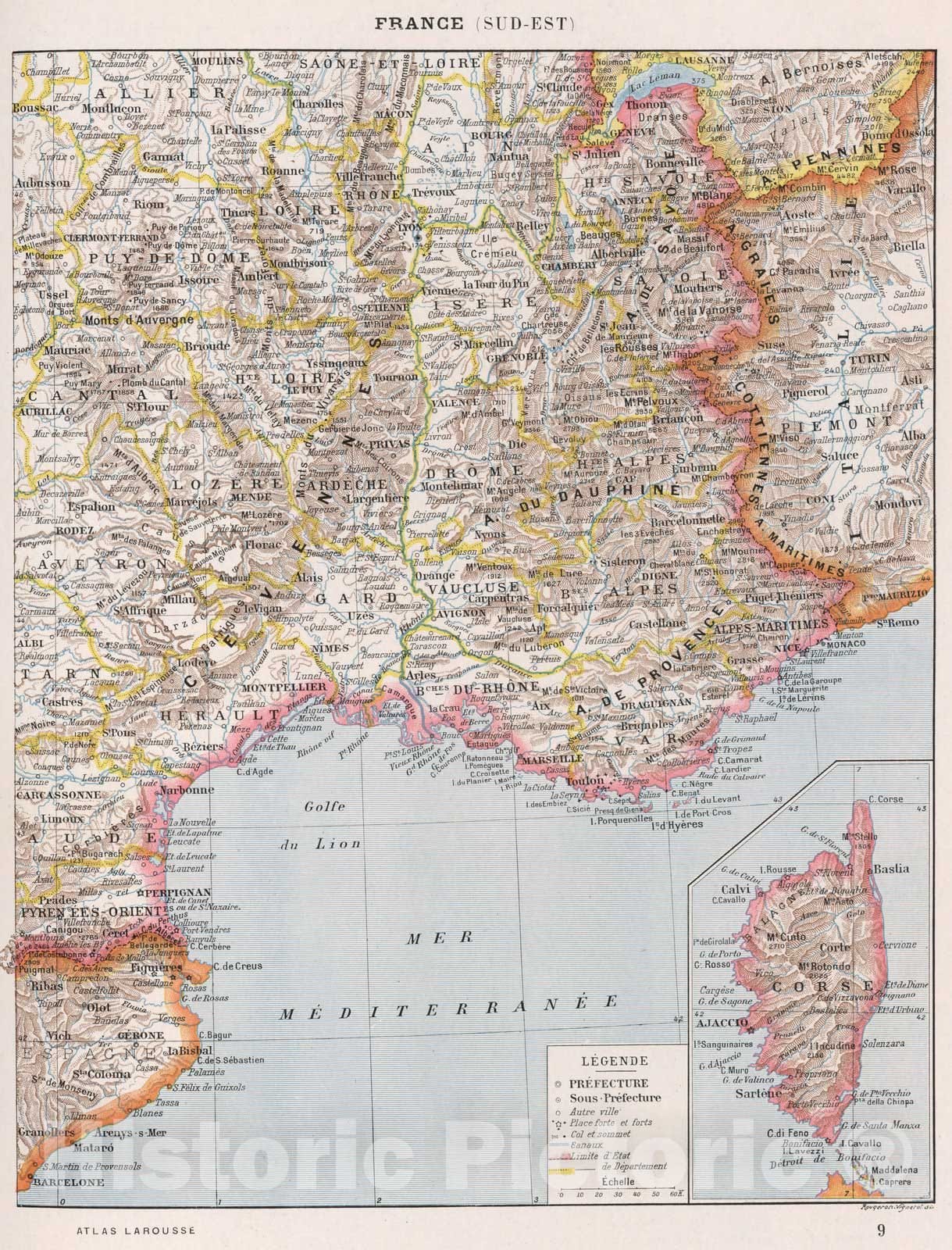 France (Sud-Est). | Atlas Larousse Illustre. Librairie Larousse, Paris. (first unillustrated title page) Atlas Larousse Illustre. 42 Cartes. - 1158 Reproductions photographiques. | Maps are printed in full and outline color. In French.