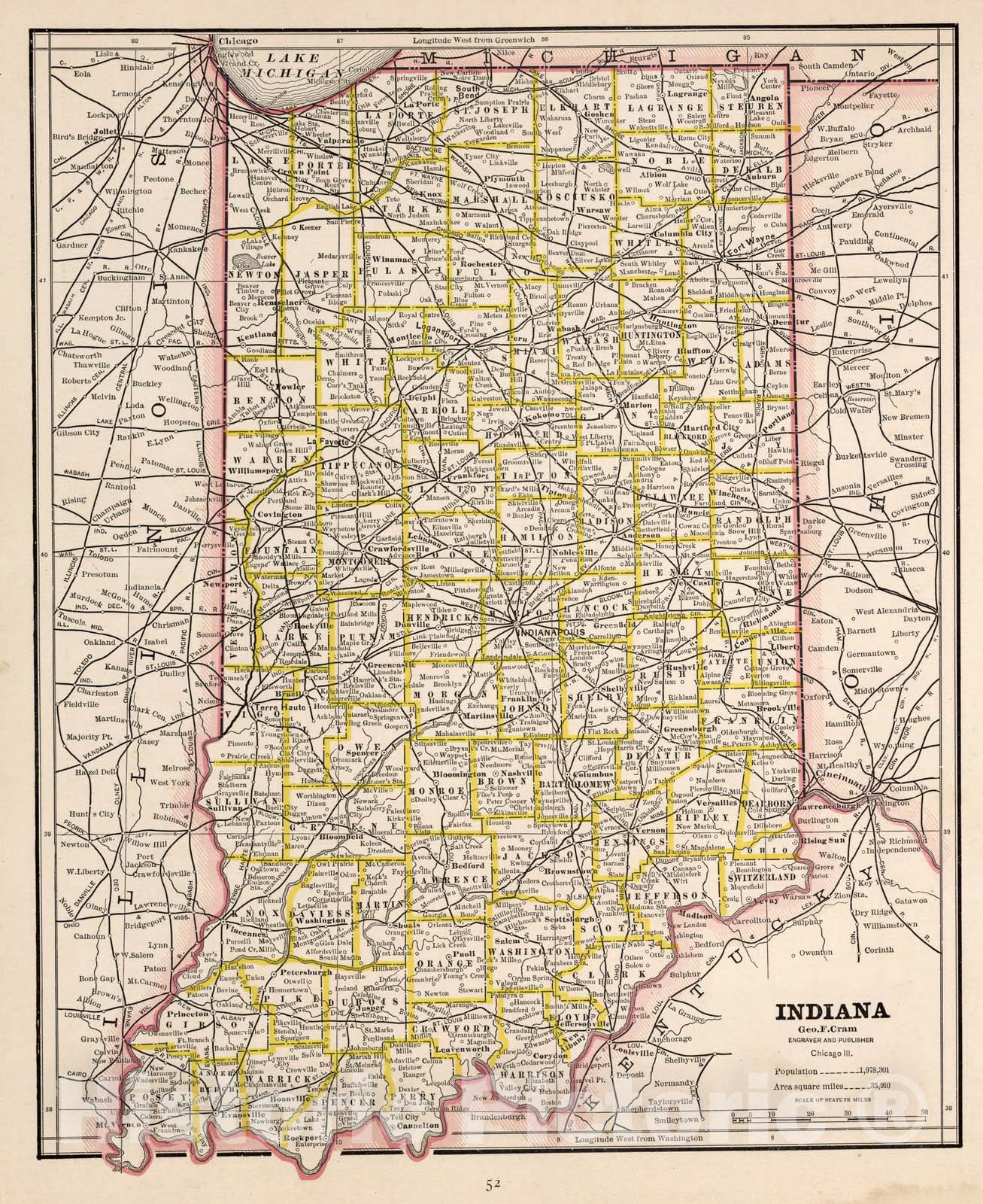Historic Map : World Atlas Map, Indiana. 1882 - Vintage Wall Art