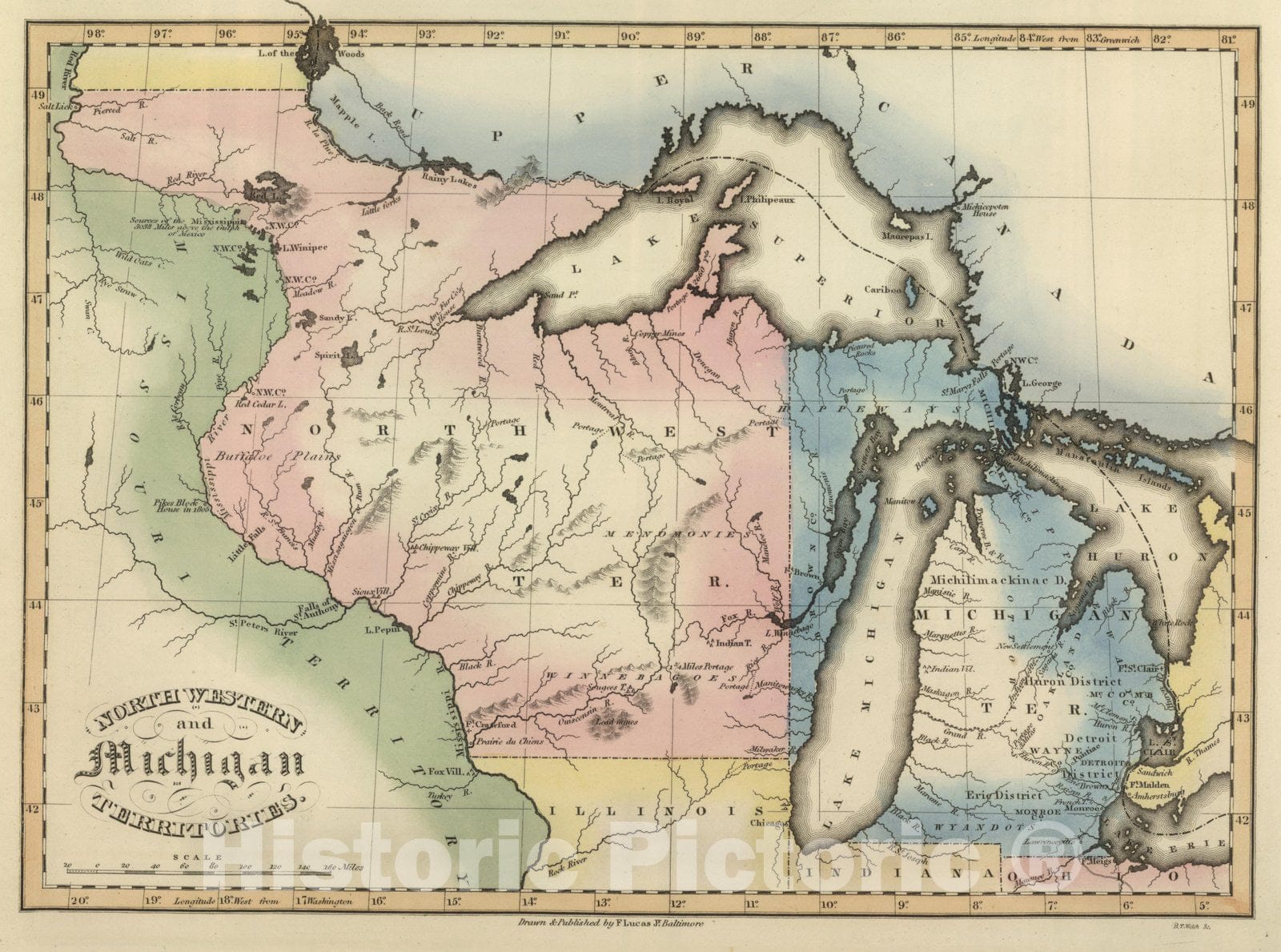 North Western and MichiganTerritories. Drawn and Published by F. Lucas Jr., Baltimore. B.T. Welch. (1822) | A General Atlas, Of All The Known Countries In The World. Baltimore: Published by Fielding Lucas, Junr. No. 138, Market Street ... | This is a very unusual Lucas atlas - according to Foster, only two copies are known. The engraved title page shows a globe and books on a table, with pages open listing Lucas' products: "Drawing Materials of every kind, Paper of all sizes, Mathematical Instruments, Globes, Maps, and Atlases of every description suitable for Colleges and Schools constantly for sale by the Publisher." It has 31 of the Tanner and Harrison engraved maps of the continents and foreign countries that appeared in the (1815) and (1816) "New And Elegant General Atlas" (only Netherlands bears Lucas' imprint, engraved by Young & Delleker, and is basically the same as the map that appears in the 1823 "General Atlas Containing Distinct Maps..." ). Of the remaining 36 maps, 8 are of South America and the West Indies and are unchanged in the 1823 atlas; the other 28 maps are in many cases early states of the new U.S. maps that appear in the 1823 atlas and replace the Tanner engraved U.S. maps of 1815 and 1816 atlases. They all have Lucas' imprint and show various engravers, Welch, Young & Delker, Cone & Freeman, Kneass, and Hufty. Compared to the early 1823 atlas (our #4584), 16 of the 28 U.S. maps are earlier issues, with only one being a later issue - New Hampshire shows Merrimack County (1823) which does not appear on the early 1823 atlas map (this was probably drawn in anticipation of creation).