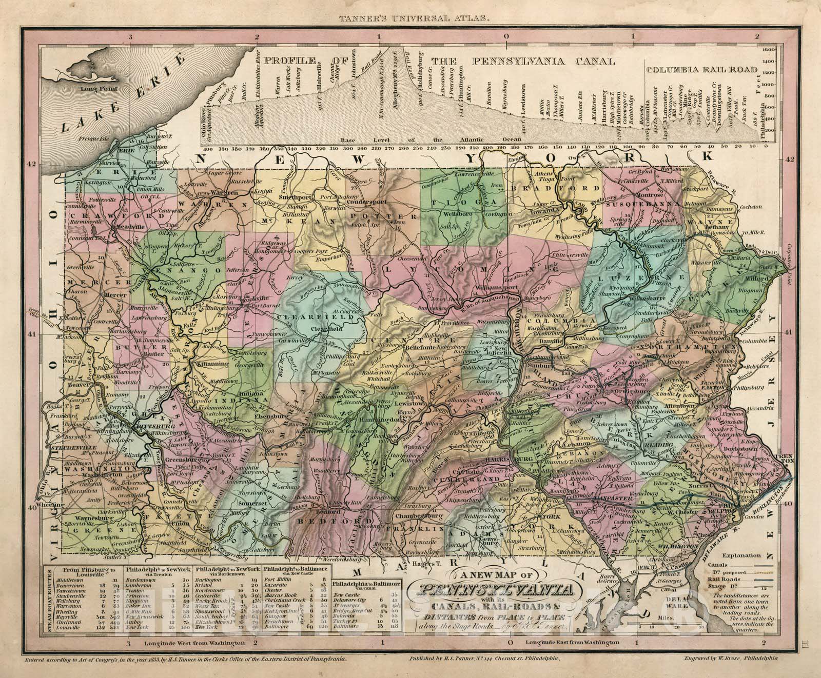 A New Map of Pennsylvania. Profiles of the Pennsylvania Canal and Columbia Rail Road.. | Tanner's Universal Atlas. No. ... of a New and Elegant Universal Atlas ... Constructed from the Most Recent and Authentic Documents by H.S. Tanner ... Philadelphia: Published by the Author, 144 Chestnut Street. (1833-) 1836. Subscription Price $1.00 a Number - separate Numbers $1.50 each. (parts 1-15 of the Universal Atlas, lacking parts 7 and 13.) | 13 complete parts of 15 parts issued between 1833 and 1836. In the original blue printed wrappers. Has two of the three maps (France and Spain/Portugal, but not England) that Tanner instructs the binder to throw out in favor of larger versions published later in the series. Includes the important part number 15 which has the title page, author's notice, table of contents, index, and notice to the binder. It is unusual to find this atlas in the original parts, unbound. However,this was representative of how these maps were typically sold, rather than in a single bound set. Relief shown in hachures.