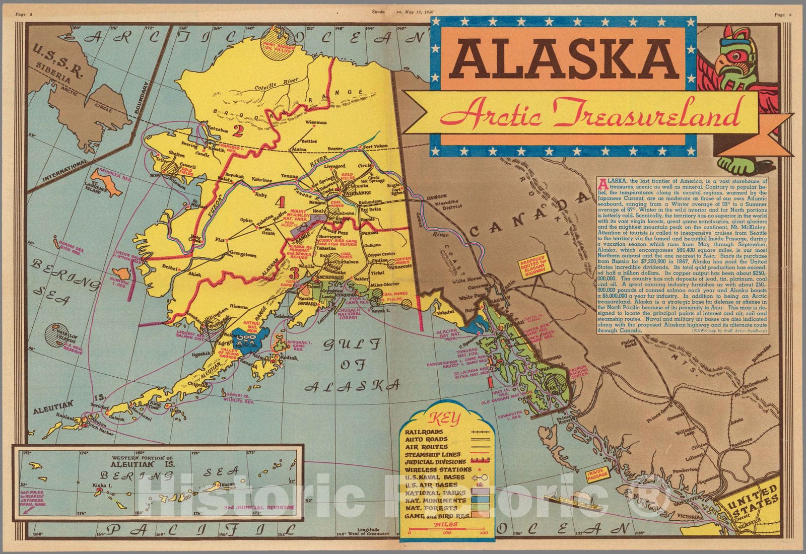 Alaska Arctic treasureland. Sunday News. May 12, 1940. (News map by staff artist Sundberg). (inset) Western portion of Aleutian Is. | Alaska Arctic treasureland. Sunday News. May 12, 1940. (News map by staff artist Sundberg). (inset) Western portion of Aleutian Is. | See note field above.