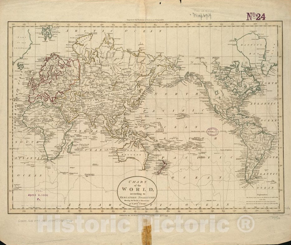 Historical Map, 1799 Chart of the world according to Mercators projection, shewing the tracks & discoveries of Captn. Cook, Vintage Wall Art