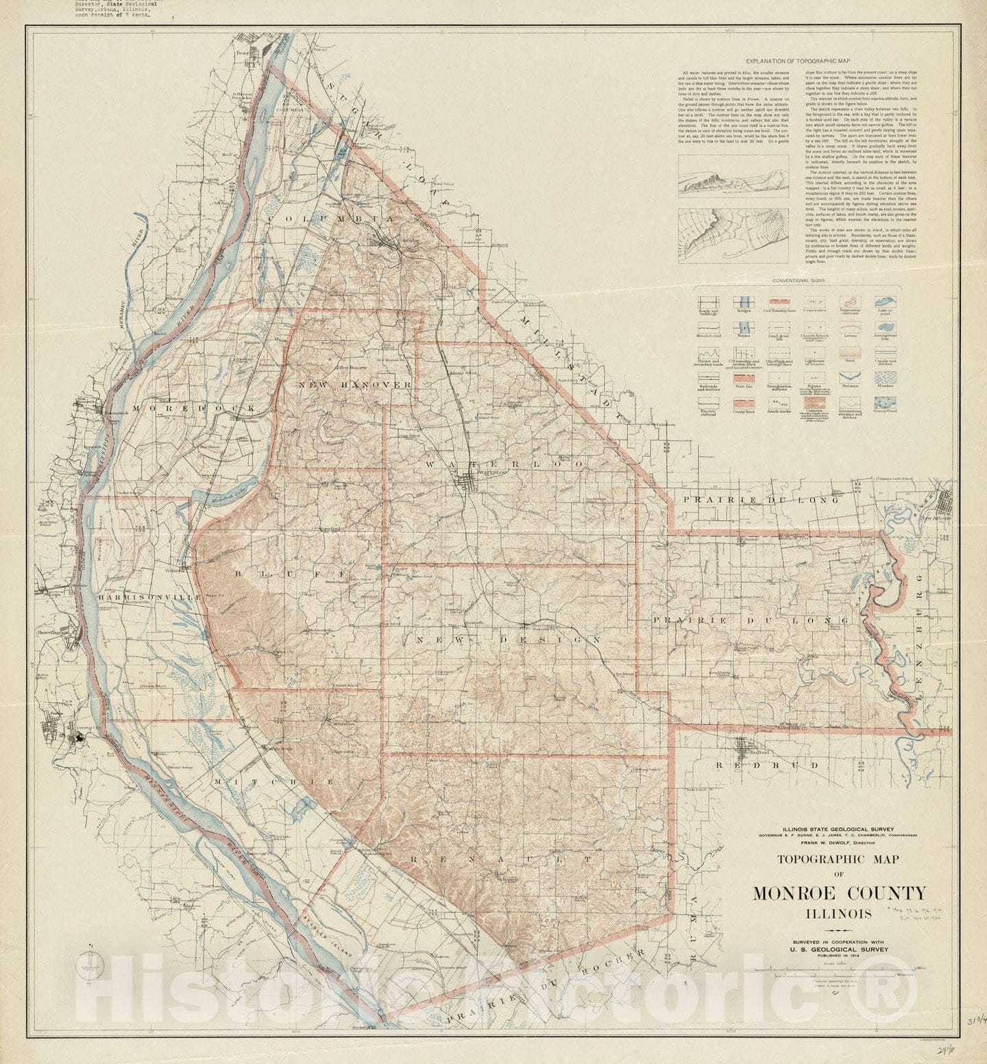 Historical Map, 1914 Topographic map of Monroe County, Illinois, Vintage Wall Art