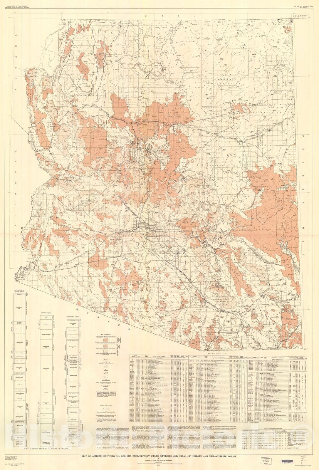 Map : Map of Arizona showing oil, gas, and exploratory wells, pipelines, and areas of igneous and metamorphic rocks, 1959 Cartography Wall Art :