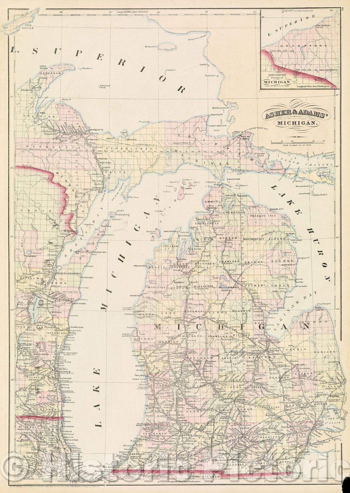 Historic Map : Asher and Adams' Michigan., 1874 , Vintage Wall Art