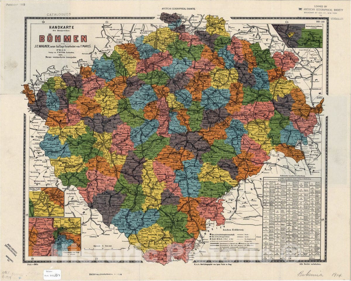 Handkarte des Konigreiches Bohmen mit der politischen Einteilung / von J.E. Wagner, neue Auflage bearabeitet von F. Mares.