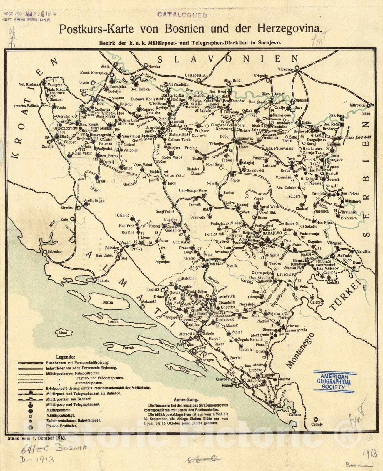 Map : Bosnia and Herzegovina 1913, Postkurs-Karte von Bosnien und der Herzegovina , Antique Vintage Reproduction
