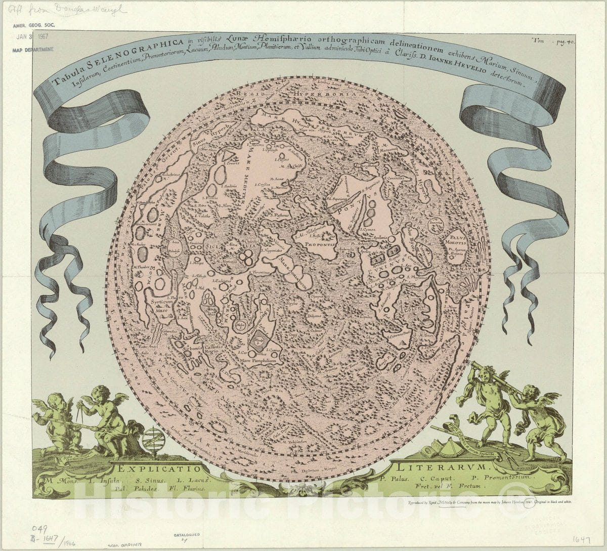 Tabula selenographica : in visibilis' lunae hemisphaerio orthographicam delineationem exhibens marium, sinuum, insularum, continentium, promontoriorum lacuum, paludum, montium, planitierum, et vallium / adminiculo Jubi Optici a clariss. D. Ioanne Hevel