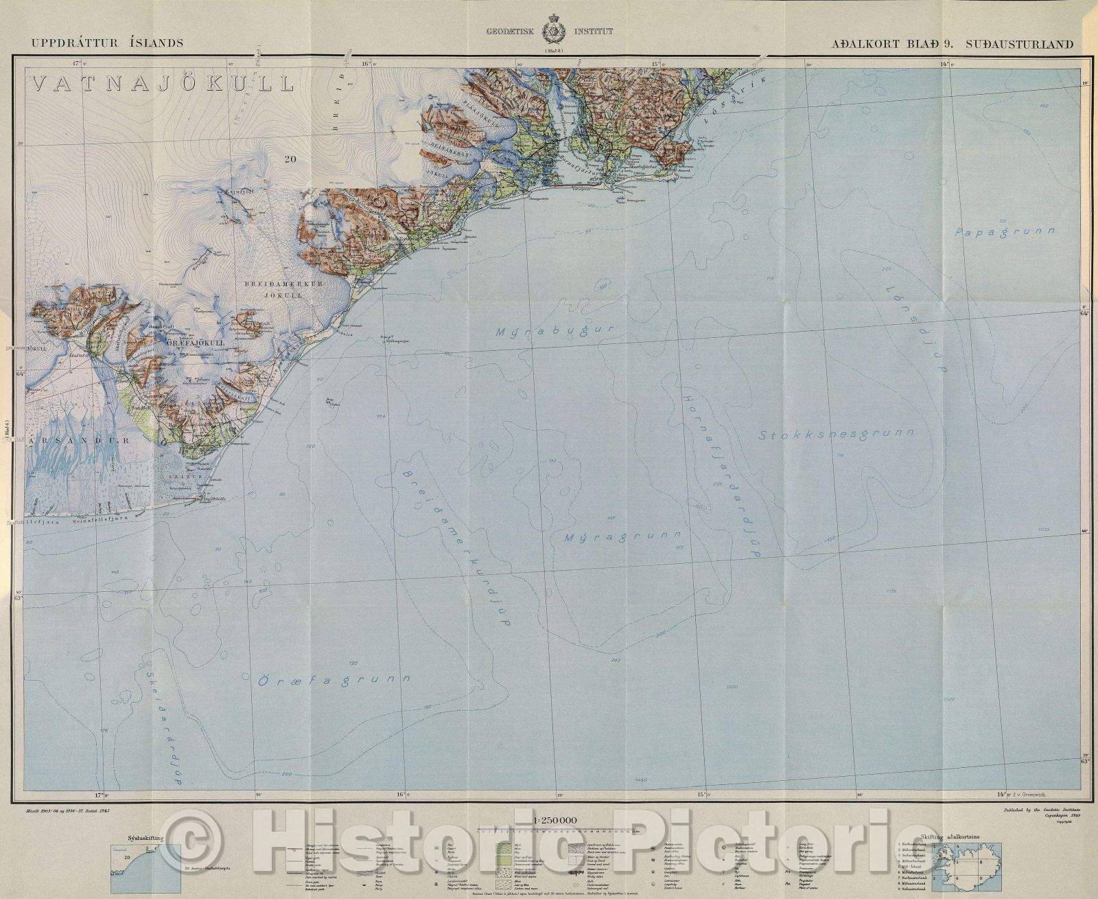 Historic Map : Color topographical map of southeast Iceland. Part of a set of 9 maps., 1949 , Vintage Wall Art