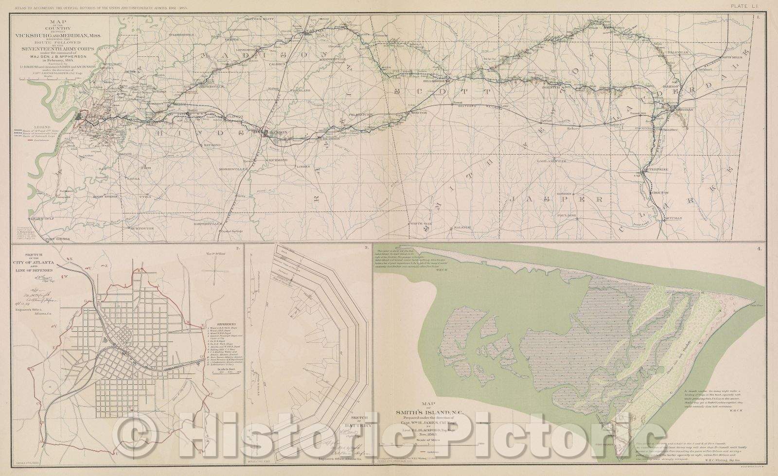 • Historic Map : Map of the country between Vicksburg and Meridian, Miss. showing the route followed by the Seventeenth Army Corps, 1864 , Vintage Wall Art