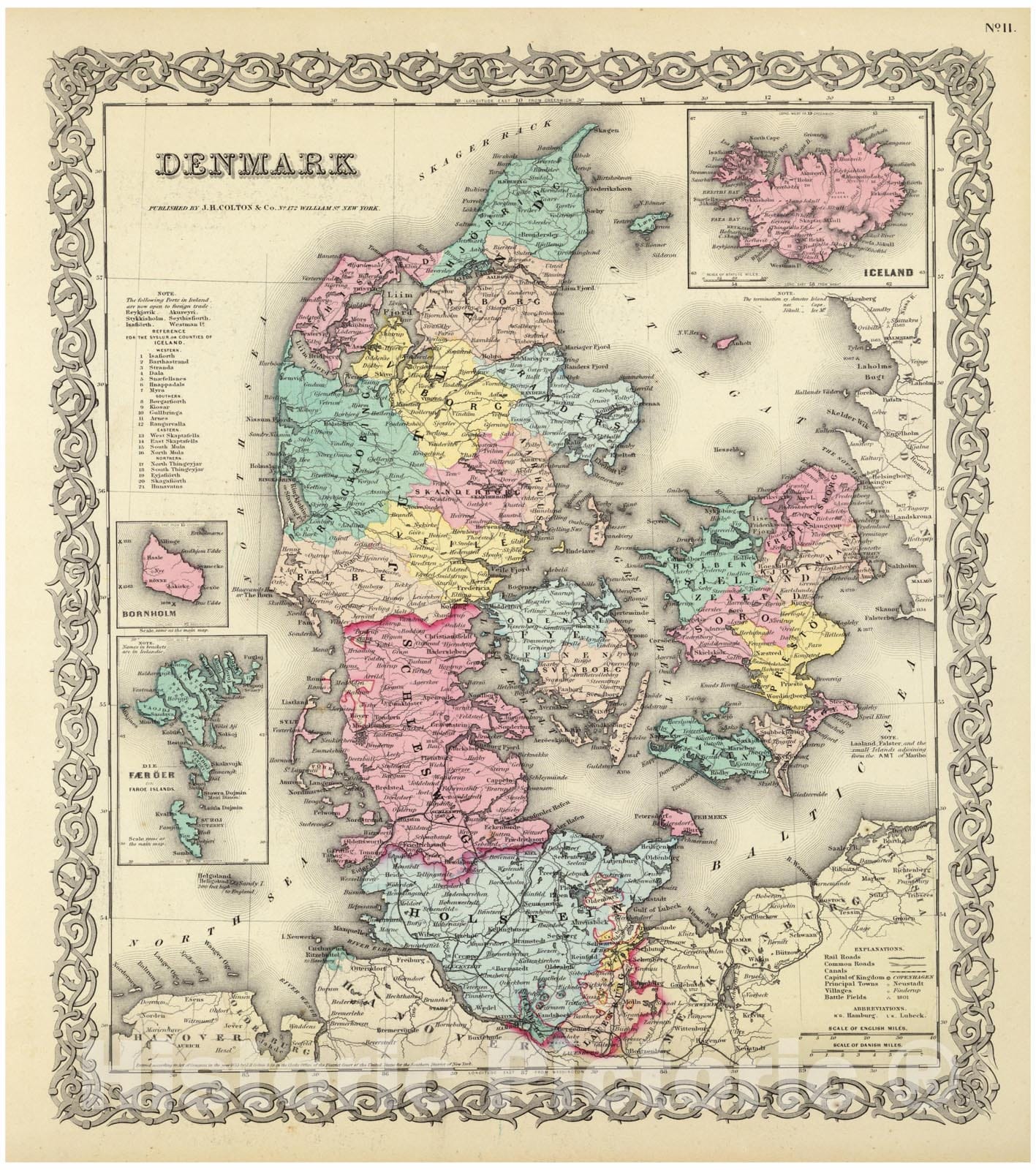 Historic Map : Denmark 1856 , Colton's Atlas World , Vintage Wall Art