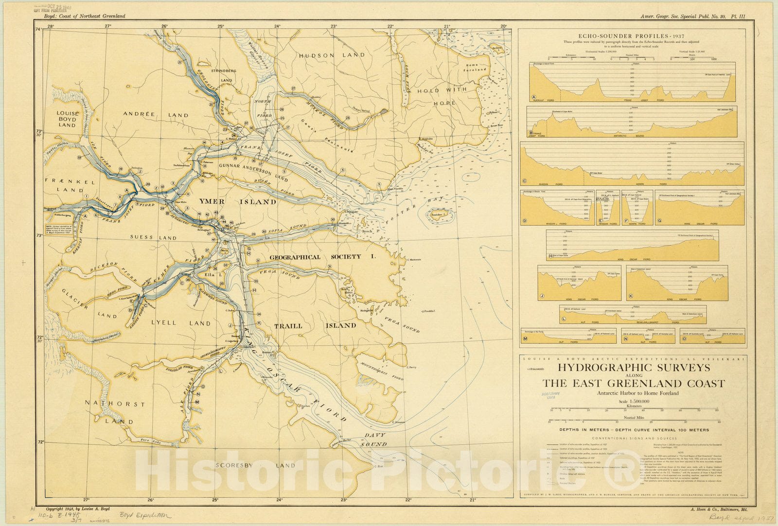 Louise A. Boyd Arctic expeditions - S.S. Veslekari hydrographic surveys along the East Greenland coast : Antarctic Harbor to Home Foreland / compiled by J.M. LeRoy, Hydographer and F.W. Buhler, Surveyor and drawn at the American Geographical Society of