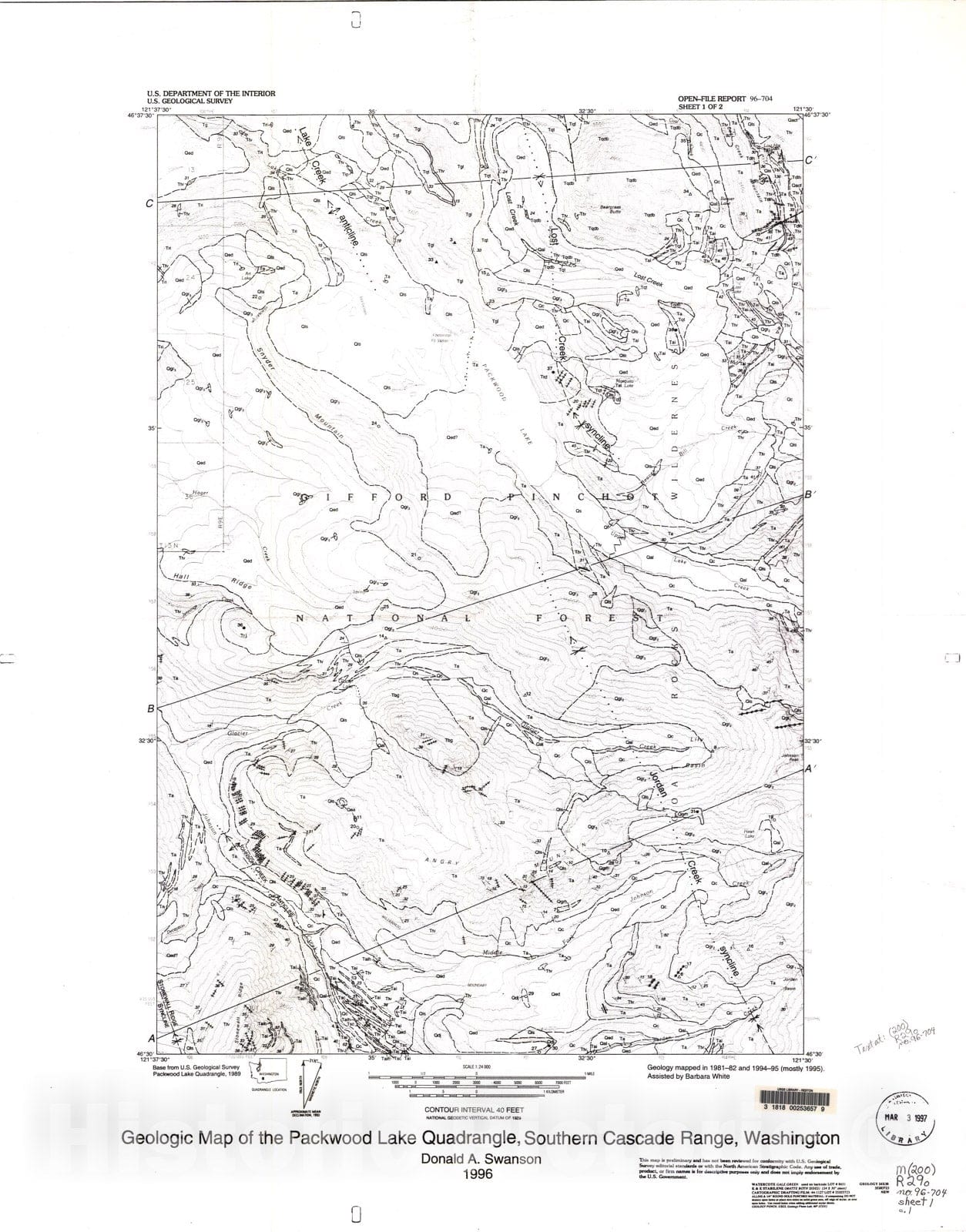 Map : Geologic map of the Packwood Lake quadrangle, southern Cascade Range, Washington, 1996 Cartography Wall Art :
