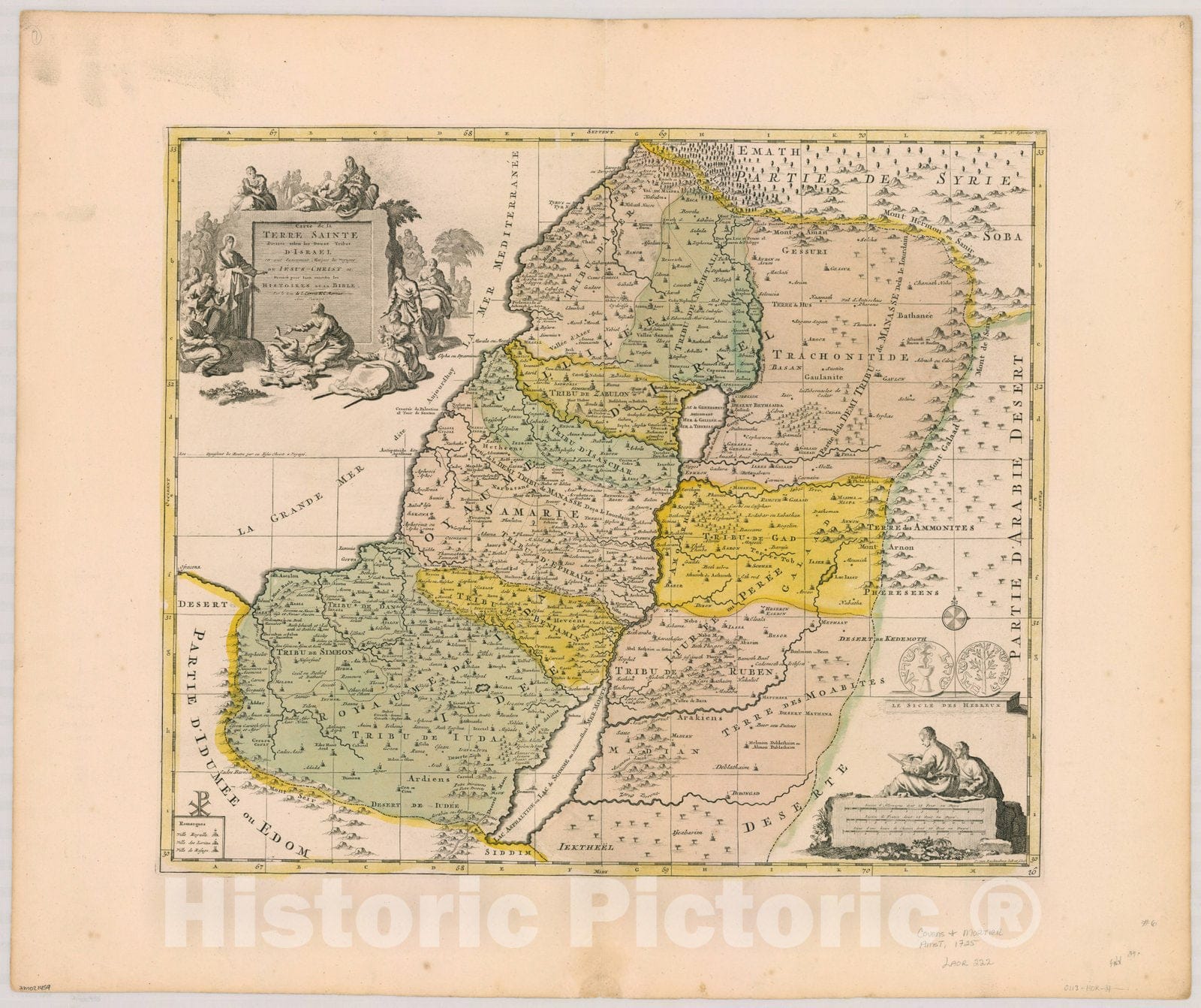 Carte de la Terre Sainte divisee selon les Douze Tribus d'Israel, ou sont exactement marques les voyages de Jesus-Christ &c. : Dressee pour bien entendre les Histoires de la Bible / par le soin de I. Covens & C. Mortier. J.van Luchtenburg deli. et schu